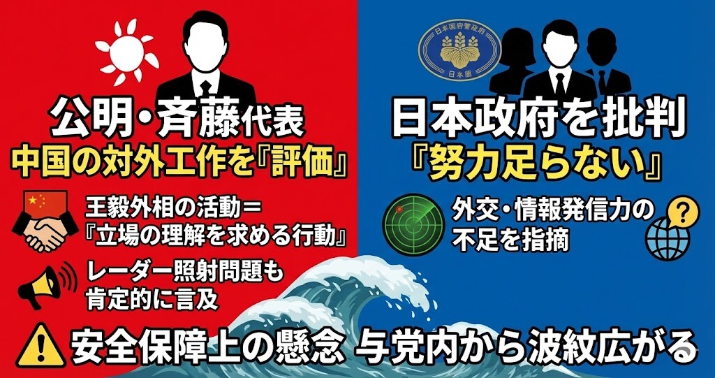 公明党の斉藤鉄夫代表は5日、仕事始めの挨拶で、中国の王毅外相の外交姿勢に言及した。「中国はレーダー照射問題につきましても、王毅外相が世界各国を回って立場の理解を求める行動をされております」と述べ、中国側の積極的な情報発信を評価。その上で、日本政府の対応について「日本は努力が足らないのではないか」と述べ、外交努力の不足を指摘した。