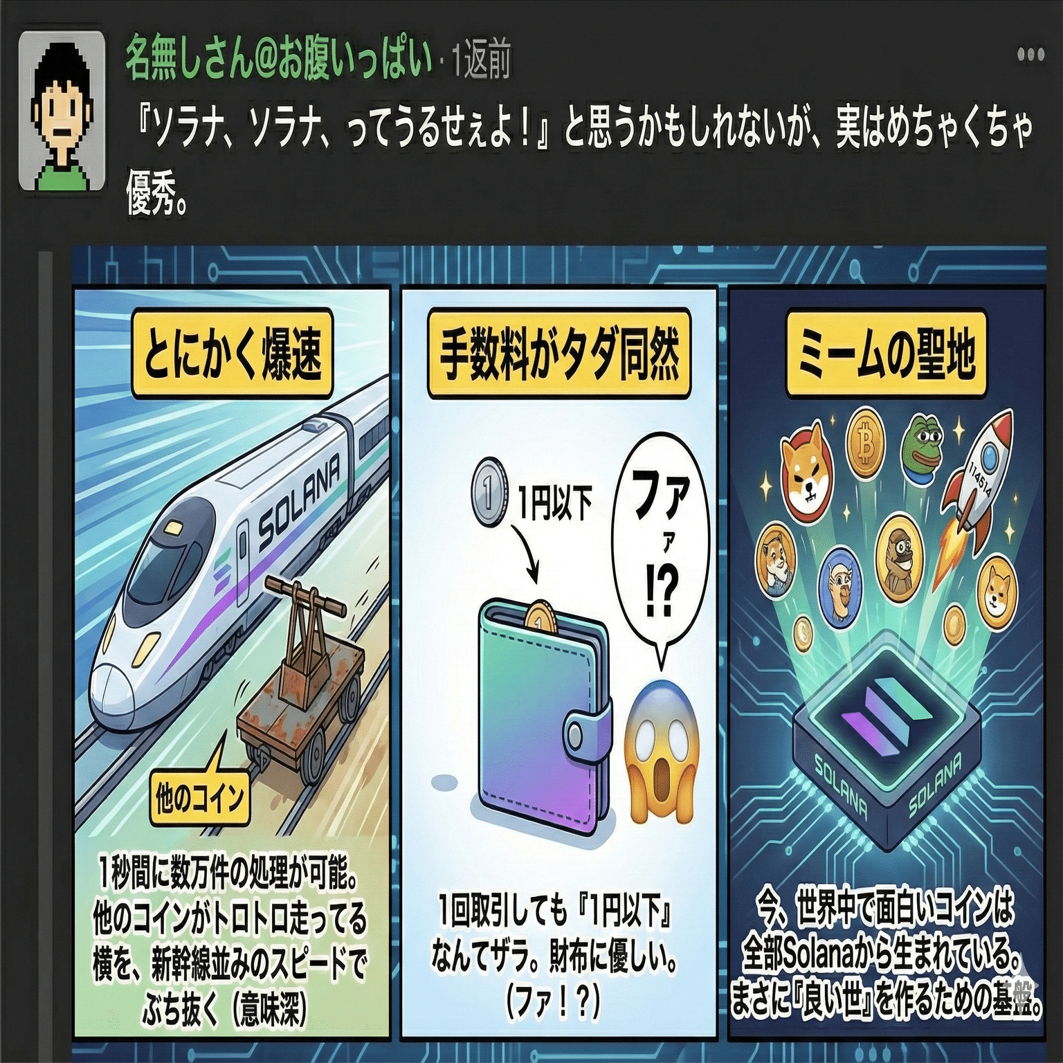 ミームの聖地: 今、世界中で面白いコインは全部Solanaから生まれている。まさに「良い世」を作るための基盤。