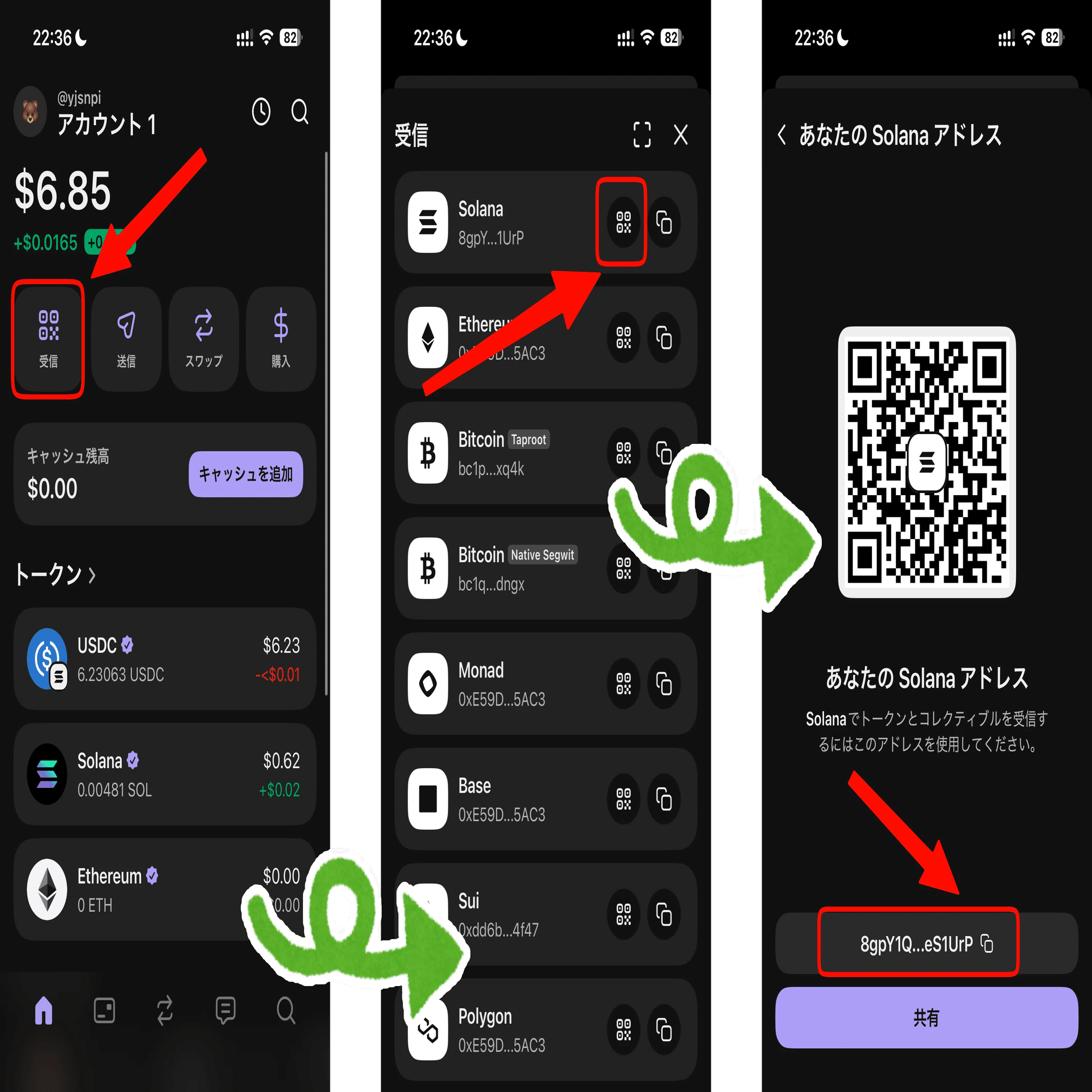 1 Phantomを開き、「受信(Receive)」をタップしてSolana(ソラナ)のアドレス(長い英数字)をコピー。