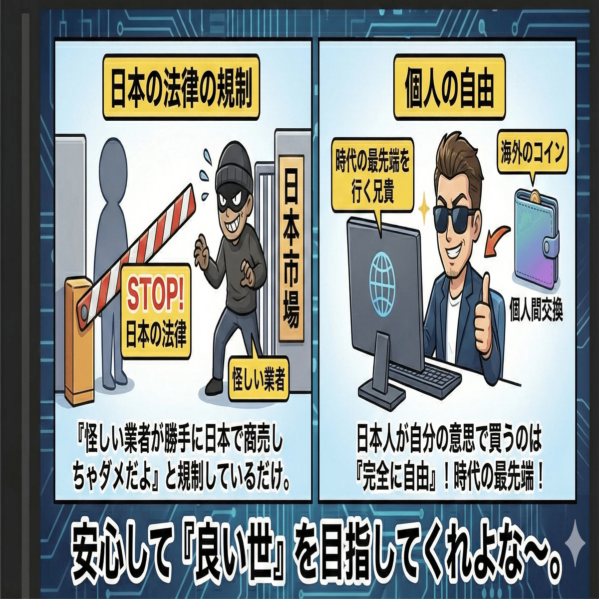 日本の法律は「怪しい業者が勝手に日本で商売しちゃダメだよ」と規制しているだけで、日本人が自分の意思で海外のコインを買ったり、個人間で交換したりするのは完全に自由。 むしろ、新しい技術に触れている「時代の最先端を行く兄貴」ってわけ。安心して「良い世」を目指してくれよな〜。