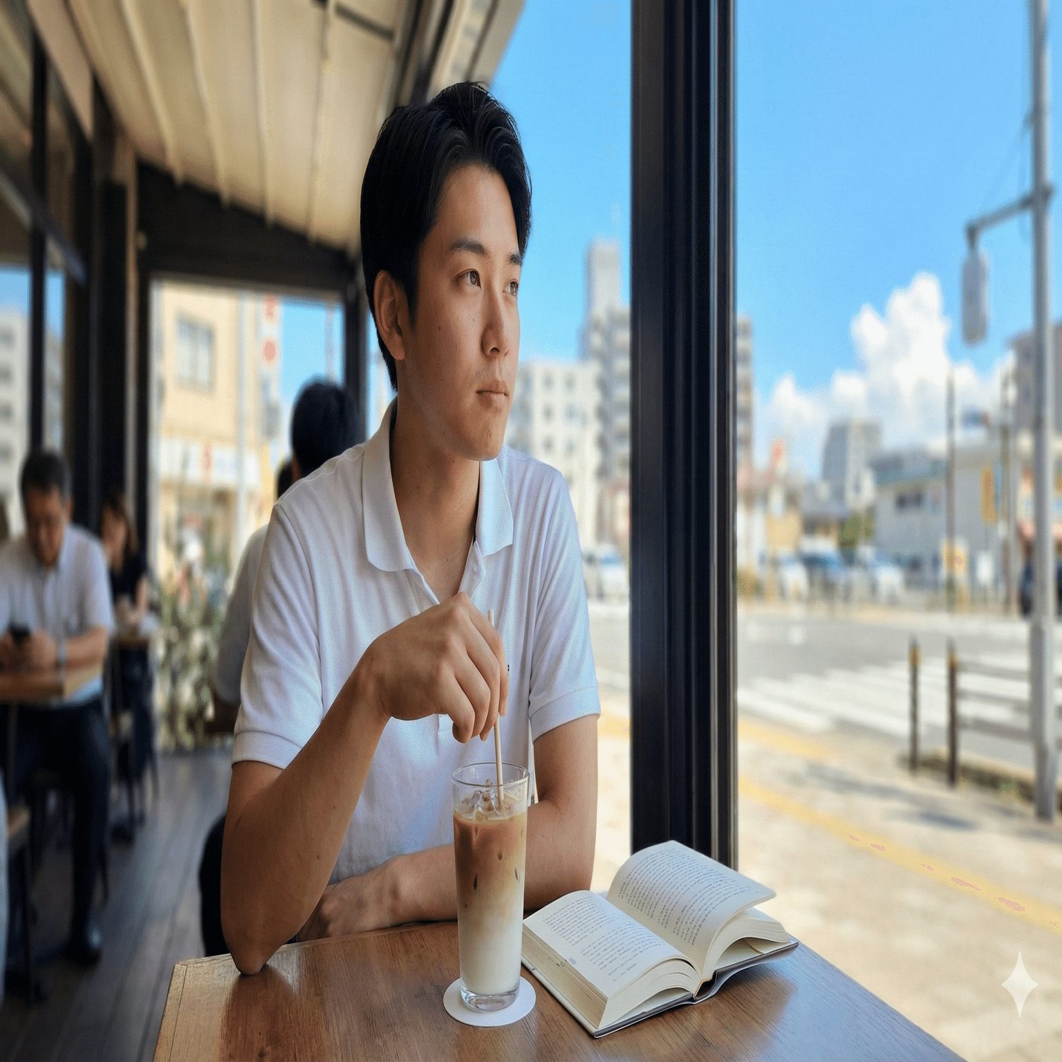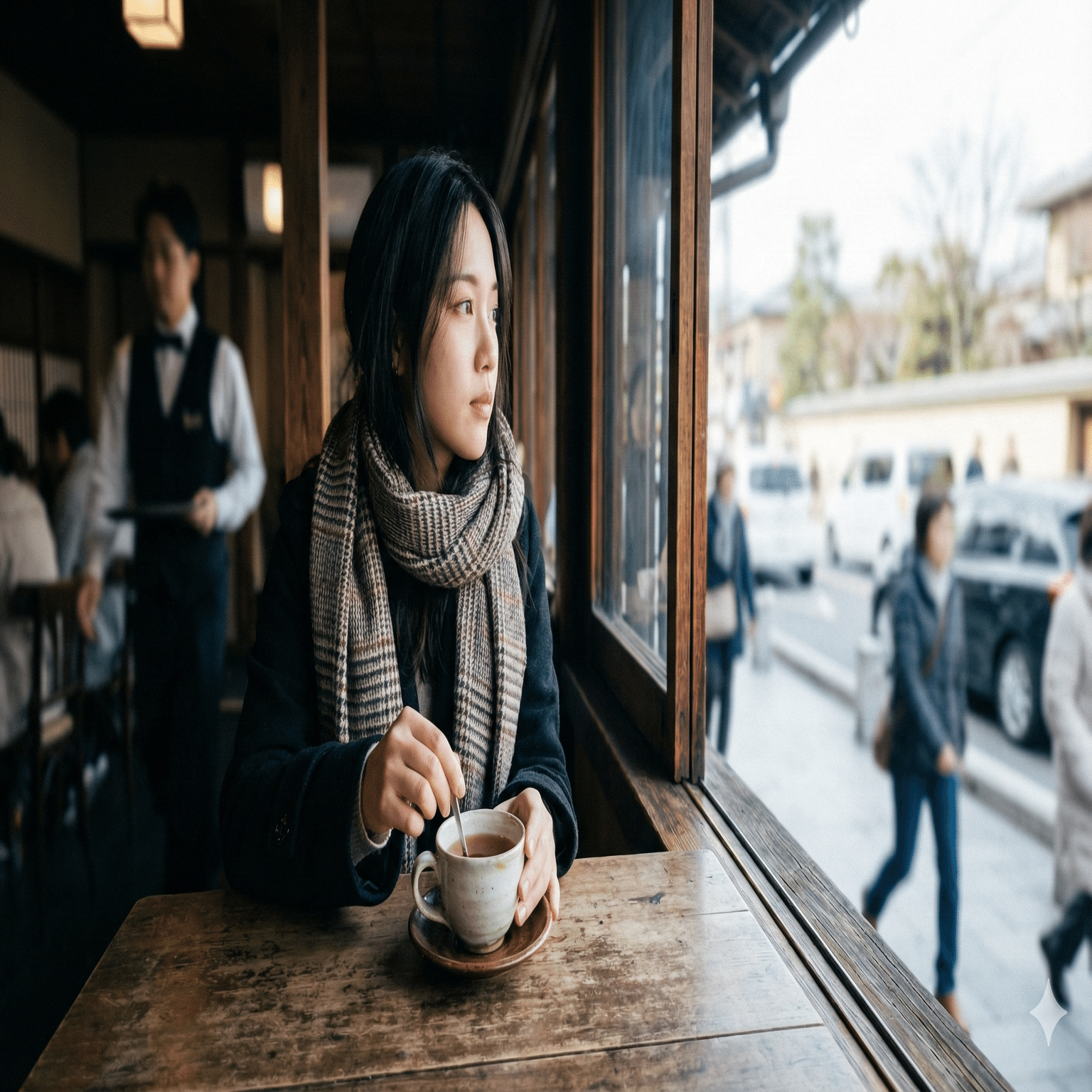 どうでしょう?自然な写真に見えるし、何より生成が一分もかからないほどのスピードでした。場所は京都を設定し、古民家風カフェでくつろいでいる女性を生成してもらいました。続いてはこちらも。
