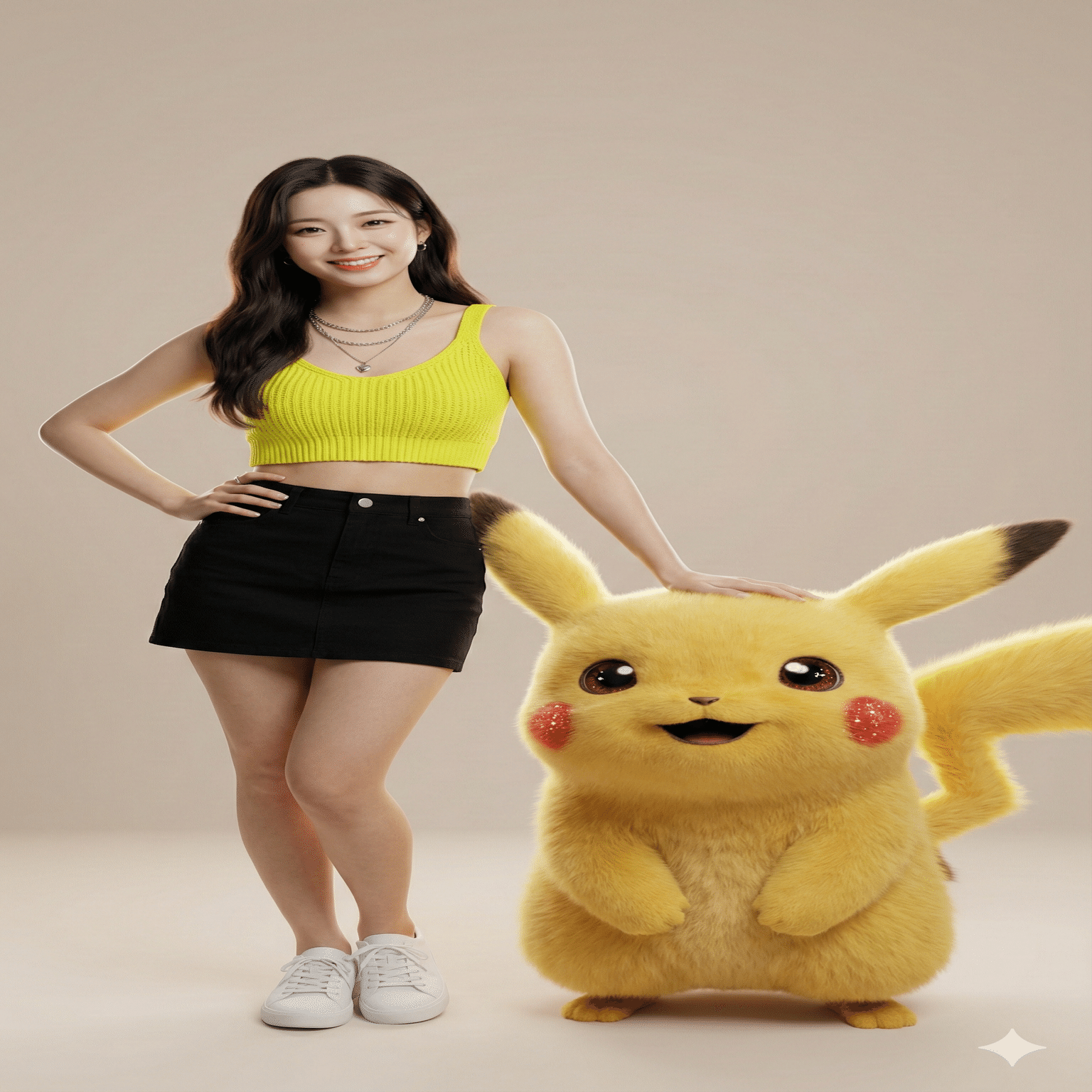 "pose": "posing confidently beside giant 3D Pikachu, hand resting on its head",