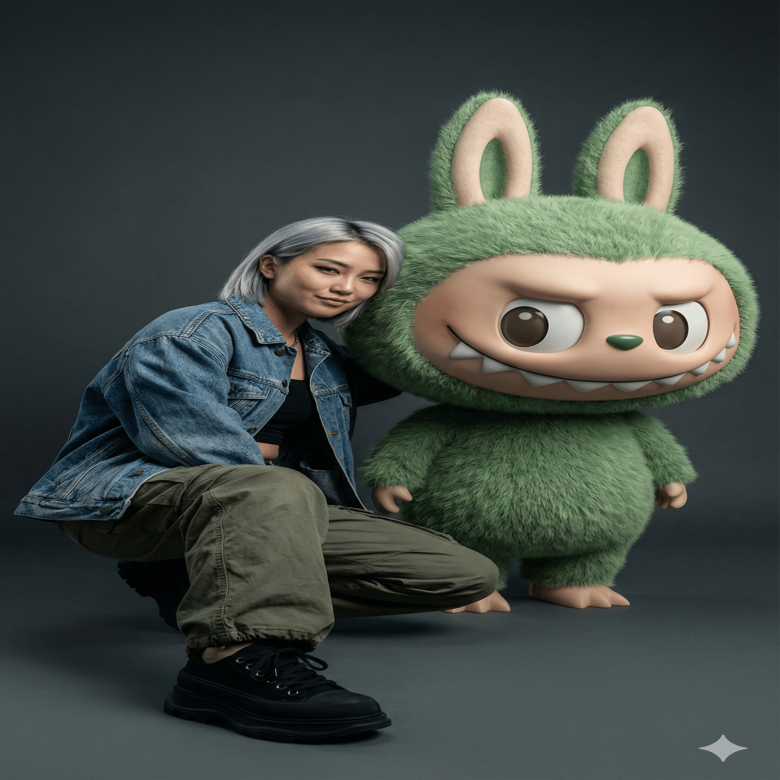 "pose": "crouching coolly beside giant 3D Labubu, leaning on its shoulder",