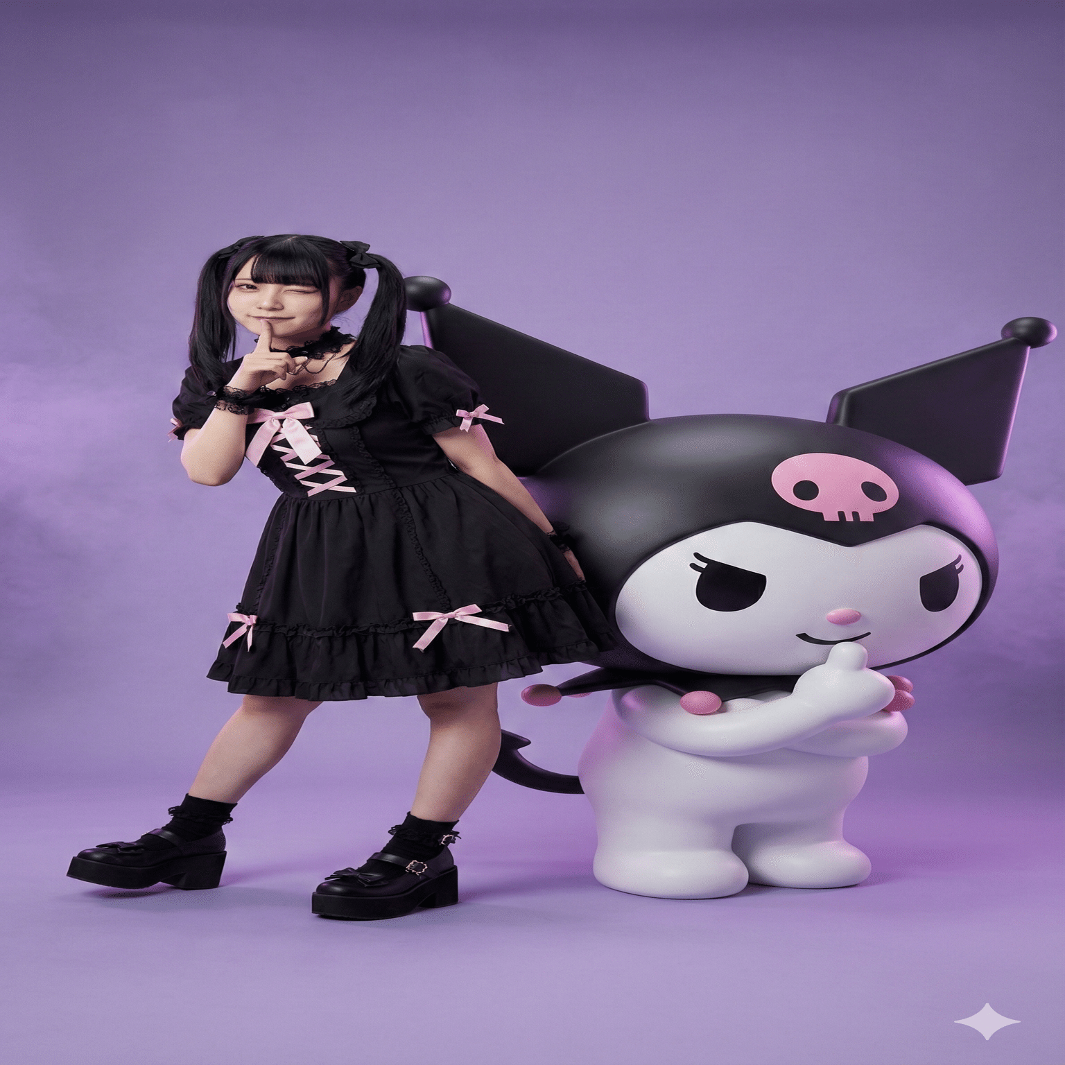 "pose": "making a 'shhh' gesture with finger on lips, leaning back against giant 3D Kuromi",