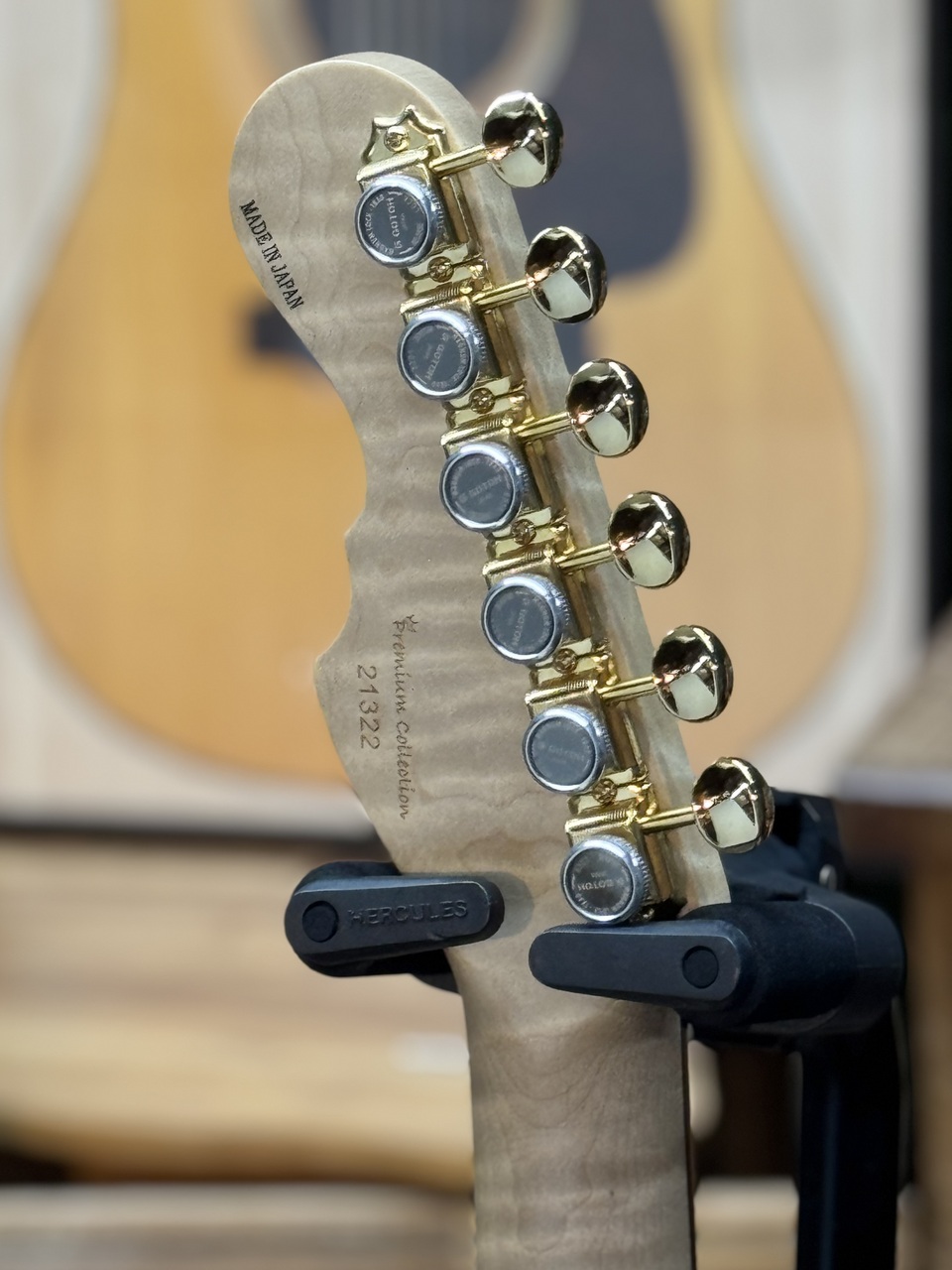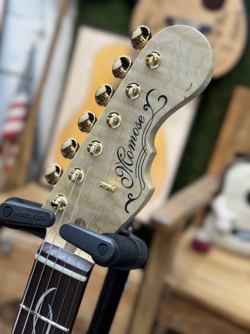 ネック材のフレイムメイプルは、ヘッドストックの先端までストライプの入ったハイグレードな個体を厳選。