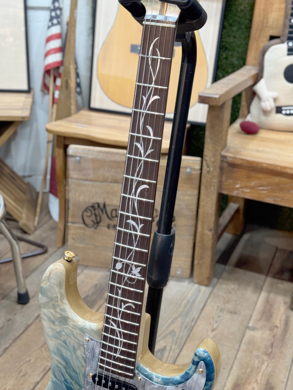 ツリーオブライフのインレイが施された指板には、近年のその需要に対して希少性を増しているマダガスカルローズウッドを採用。