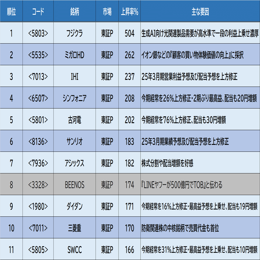 既に千社を超える検証をやっています(外国組は真面目にやってくれないのでおじさん担当の日本株が中心で700銘柄を突破したところです)。この記事では恣意的な検証結果に見えないように、2024年株価上昇率トップ10銘柄(東証プライム)の検証内容をご紹介します。(但し、8位のBEENOSはTOB情報が上昇要因なので参考扱いです。)