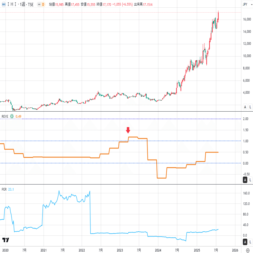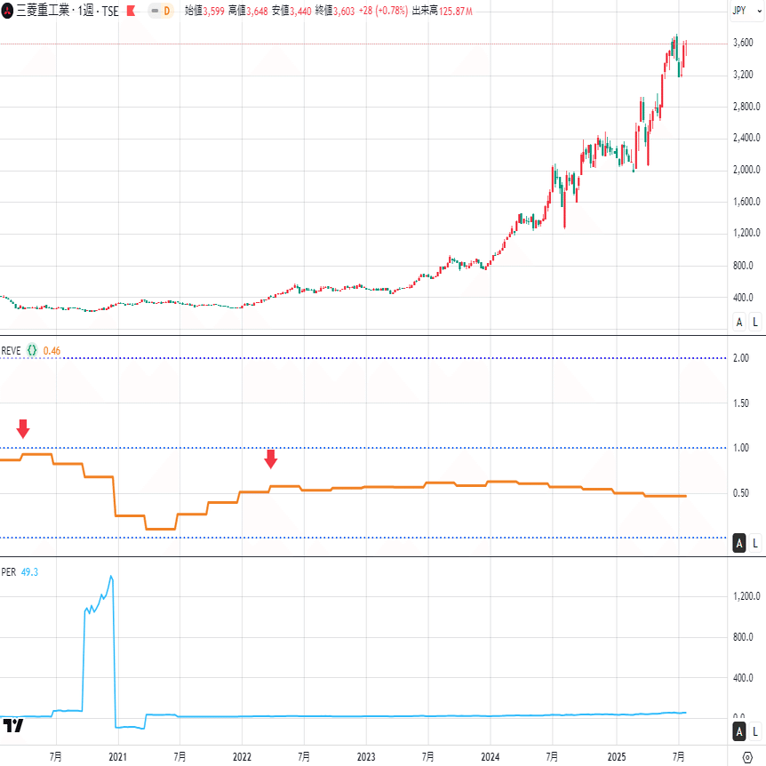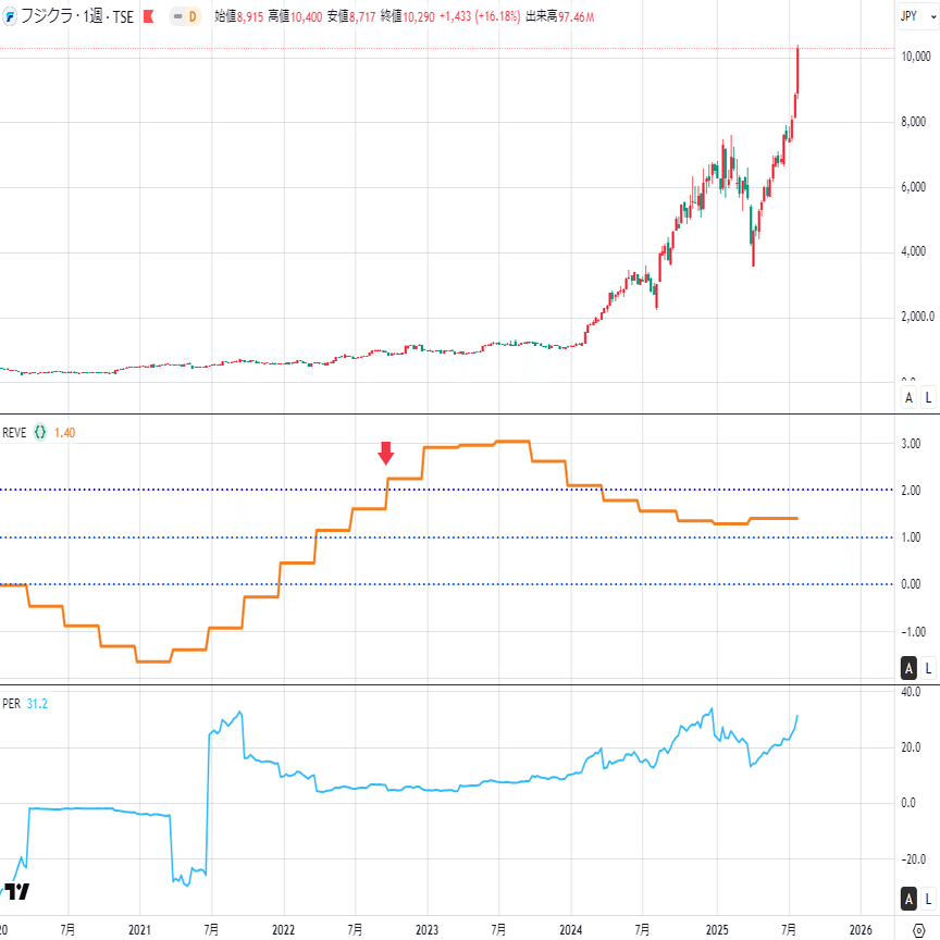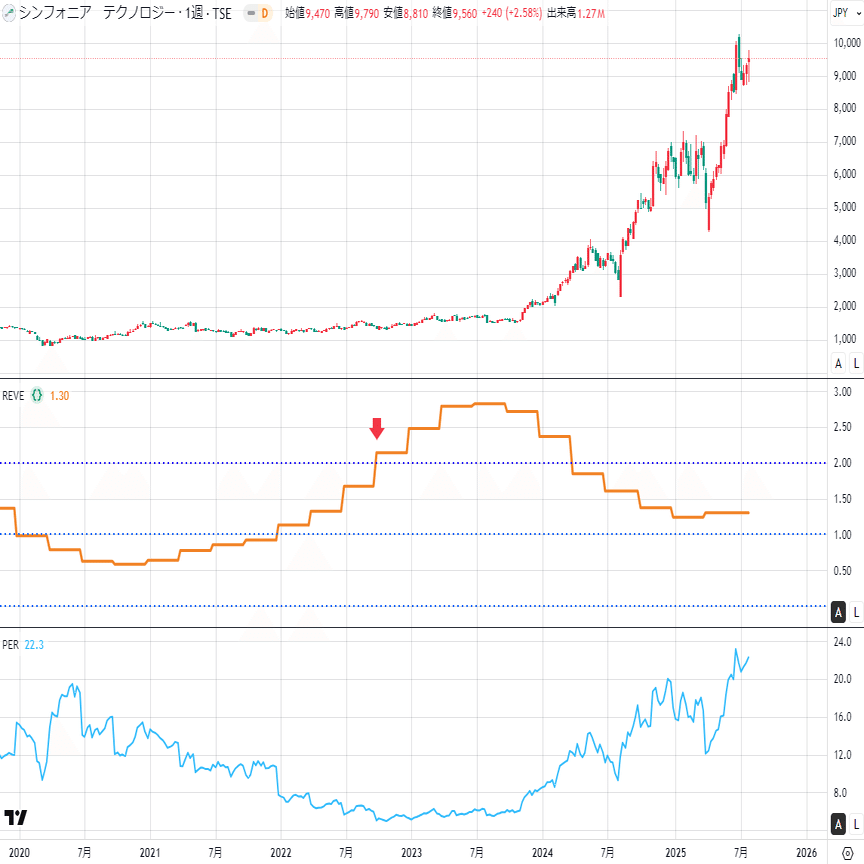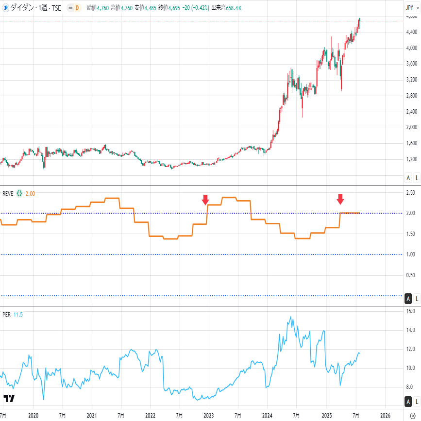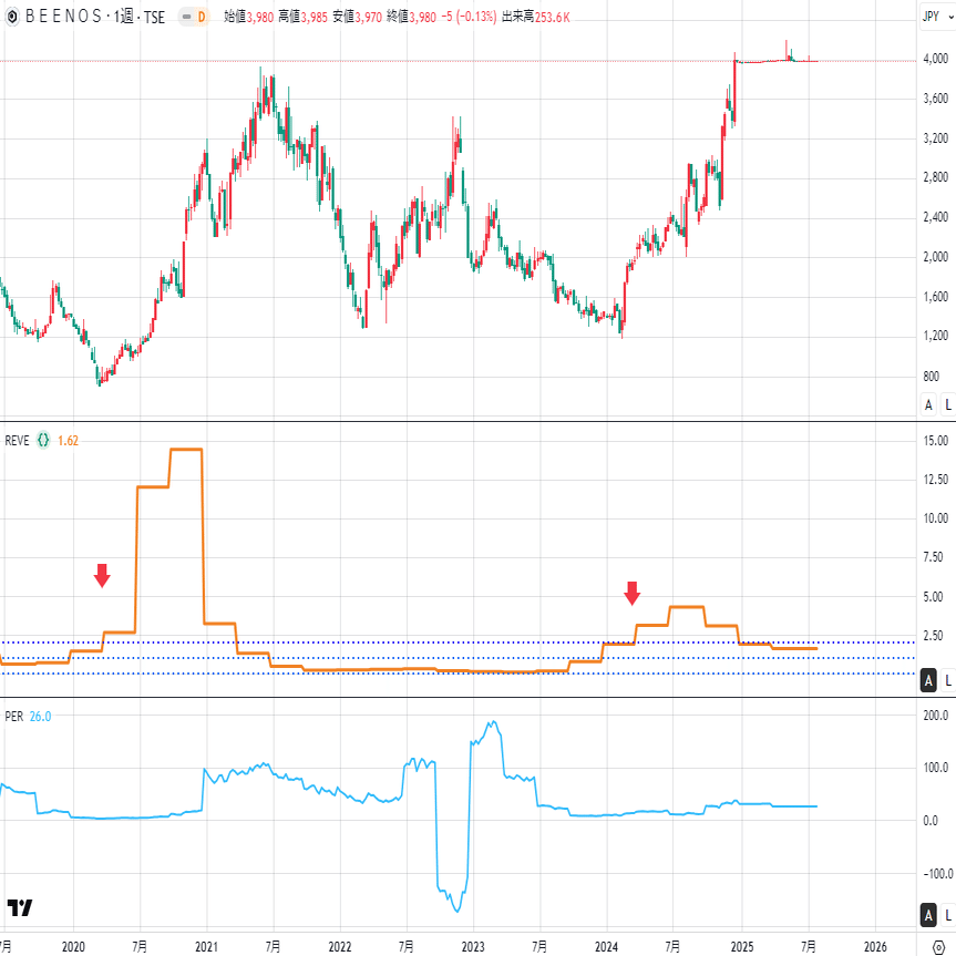 チャートは上から順に、株価・REVE・PERです。すべて週足で示しています😊 現在の判定基準は暫定ですが、矢印でエントリーポイントを示します。