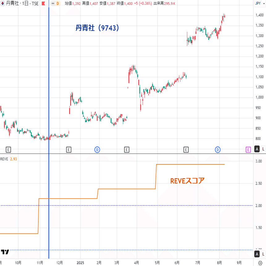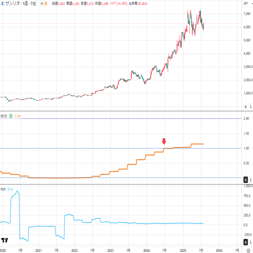 サンリオもREVEスコア上昇後に株価が急騰する典型的なパターンです。これも文句なしですね🥰