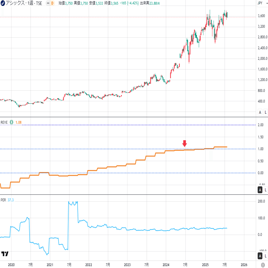 アシックスもいい感じの動きなのですが、エントリーが少し遅いかもしれません。この辺りが見直しポイントで、もう少し早い段階でREVEスコアを評価できないか、試行錯誤しています🥸