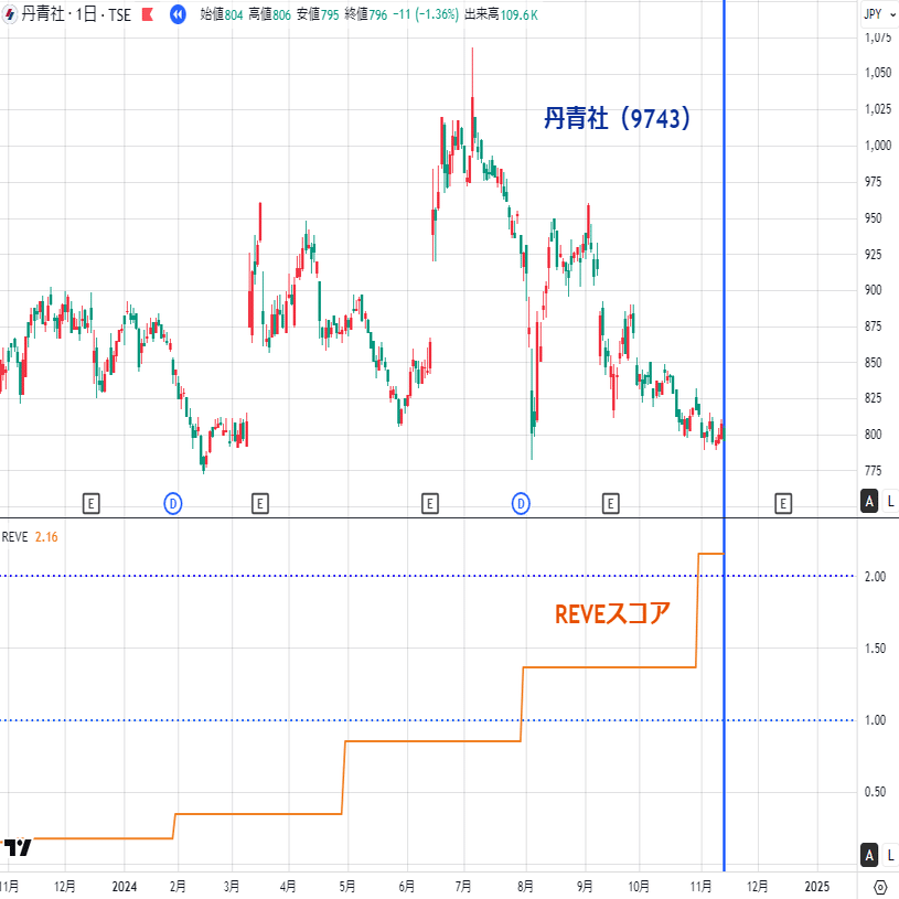 様子を見ていたら11月に入って株投資を再開したタイミングでREVEスコアが順調に上がってきていて、フジコ法とREVEの両方の買い条件にはまったので800円で買いました(6千株!)。下落中の株価チャートからではエントリーポイントが来たなんて全くわからないですよね。