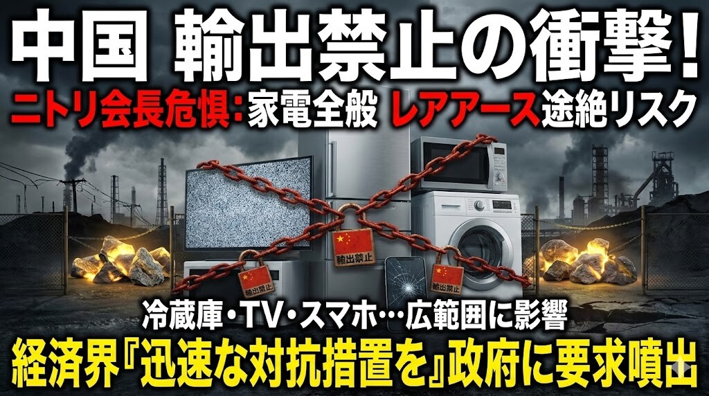 中国による「資源の武器化」が、ついに一般の生活家電にまで影を落とし始めました。ニトリの似鳥会長が懸念するように、現代の製造業において中国依存は喉元に刃を突きつけられているようなものです。これまで「安さ」を優先して中国にサプライチェーンを依存させてきたツケが、今まさに最悪の形で露呈しています。