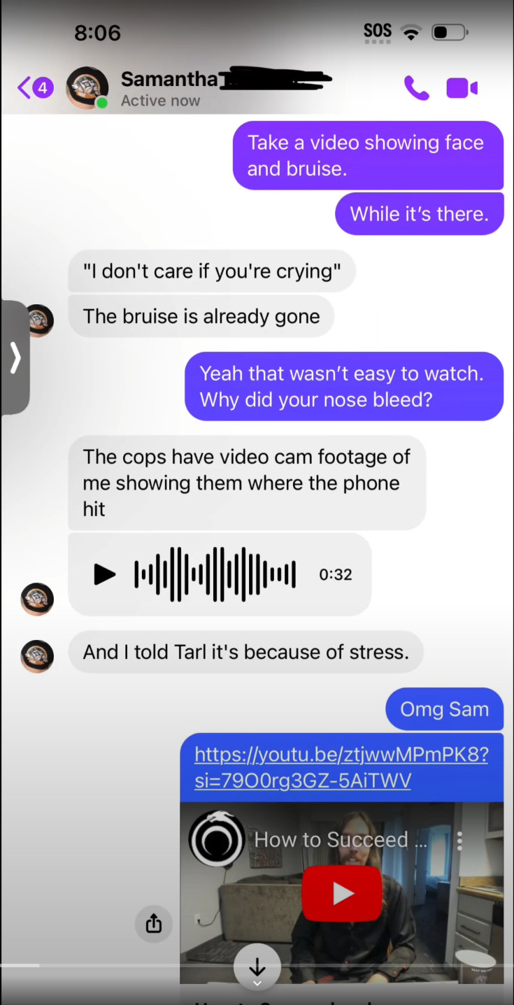 Put on a show for the cops so that they will send him to jail for the night to teach Tarl a lesson? The cell phone at the ribs mark just doesn't show up well.