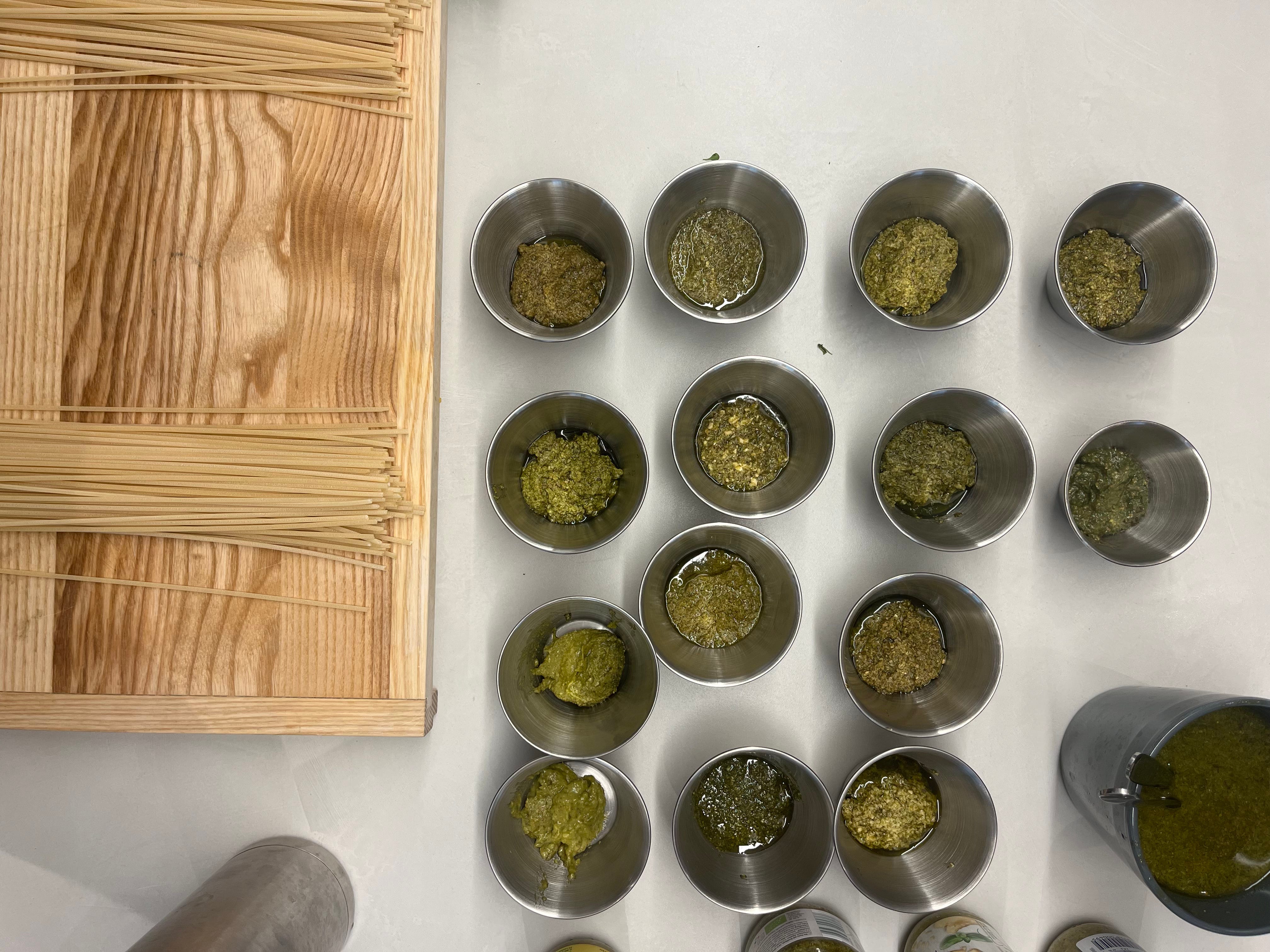 Vor dem Verkosten haben wir alle Pestos aufgewärmt, damit sich der Geschmack entwickelt, der Käse schmilzt und eventueller Knoblauch etwas gart. In der ersten Vierergruppe haben wir alle pur und auch mit Pasta verkostet - und dann beschlossen, dass pur völlig reicht und das Pesto sich auf den Nudeln geschmacklich kaum mehr verändert. Nur für die Finalrunde haben wir noch einmal die Pasta bemüht.