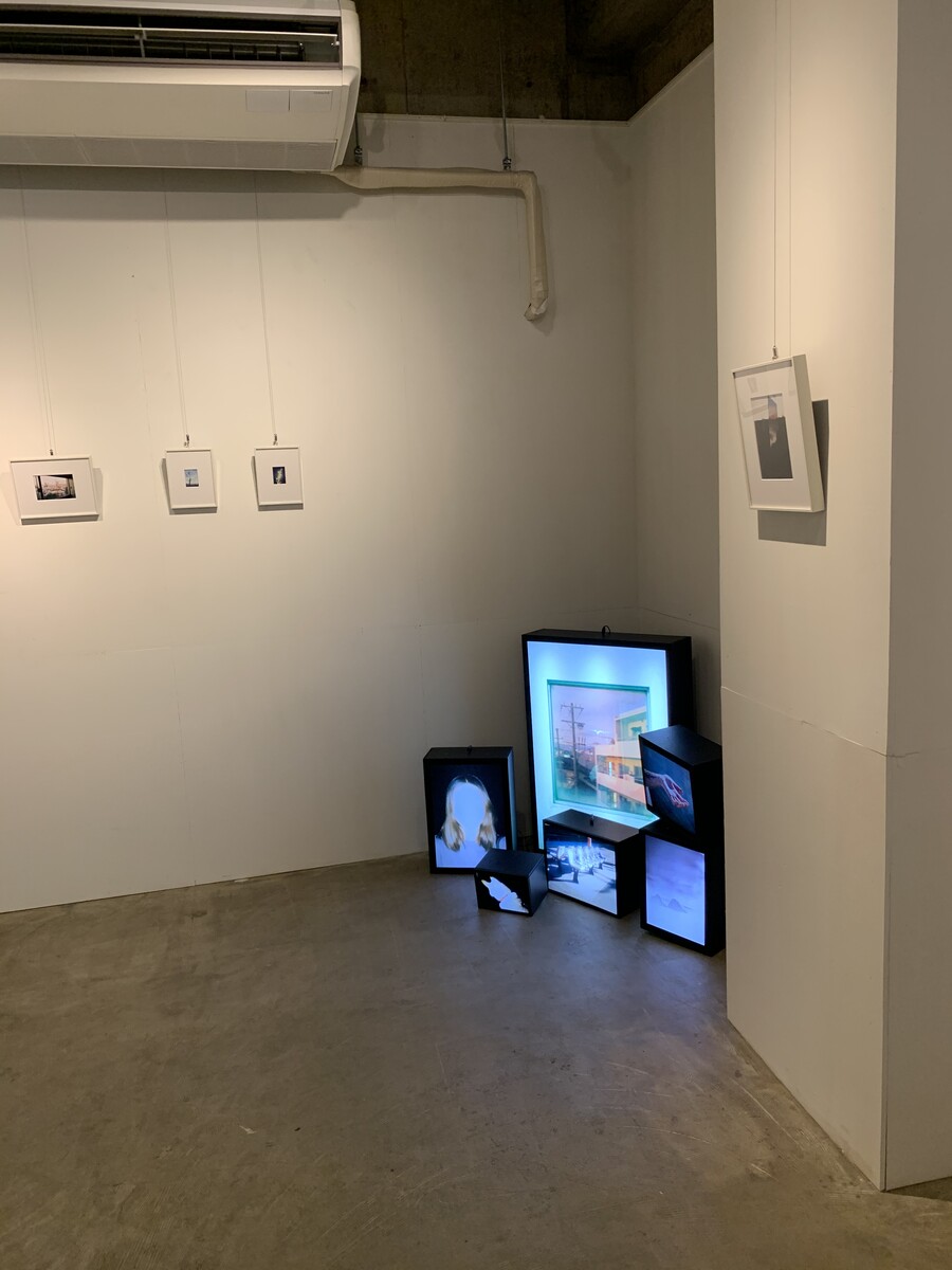 濱本さん、ホントに若い。素晴らしいことだ。写真を取り出したのは3年前。引越しの整理をしていたら旧い黄色のコダックのカメラを発見。ご両親に伺うと『20年前のもの』。現像しプリントしてみるとピンクやグリーンの画像が浮かび上がった。期限切れのフィルムなので当然だ。デジカメのクリアな画像しか見ていなかった彼女はその可笑しな色彩に心を奪われた。すぐに中古フィルムカメラを購入。キャノンAE1。私が中学生の頃に欲しかった懐かしい機種。マニュアルがないのでとにかく自己流で使ってみたそうだ。フィルムの装填の仕方もよくわからず感光してしまったことも。そこが出発点なので今回の展示にも意図的に壊したチェキを用いた写真も展示されている。瑞々しい感じがする。