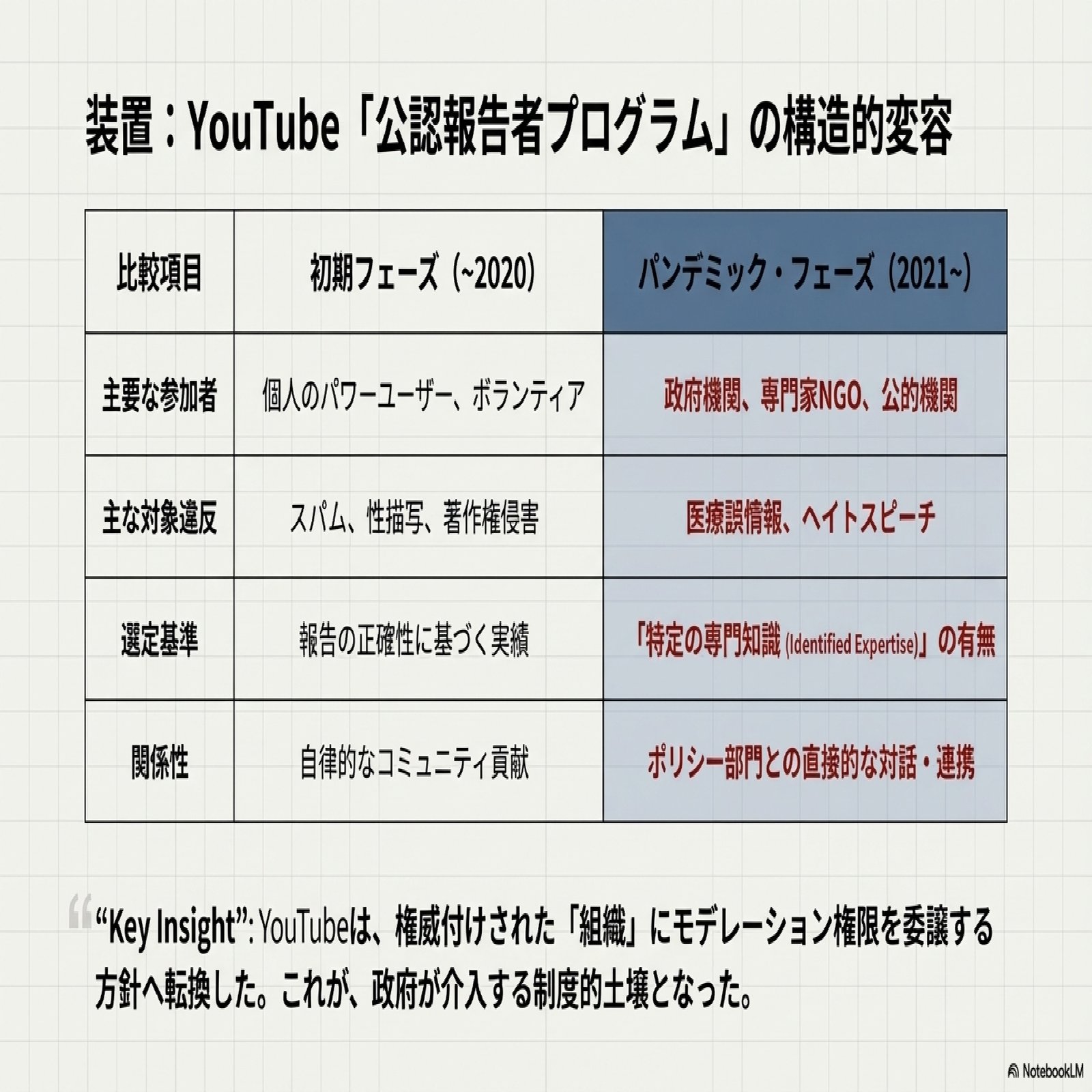 日本のワクチン政策における官民連携の特異性を理解するためには、その受け皿となったYouTubeの「公認報告者プログラム」自体が、パンデミックを契機に重大な構造変容を遂げていた事実を分析することが不可欠である。特定の専門家集団がYouTubeから特別な権限を付与されるに至った背景には、プラットフォーム側が情報管理のあり方を根本的に見直していたというグローバルな文脈が存在した。