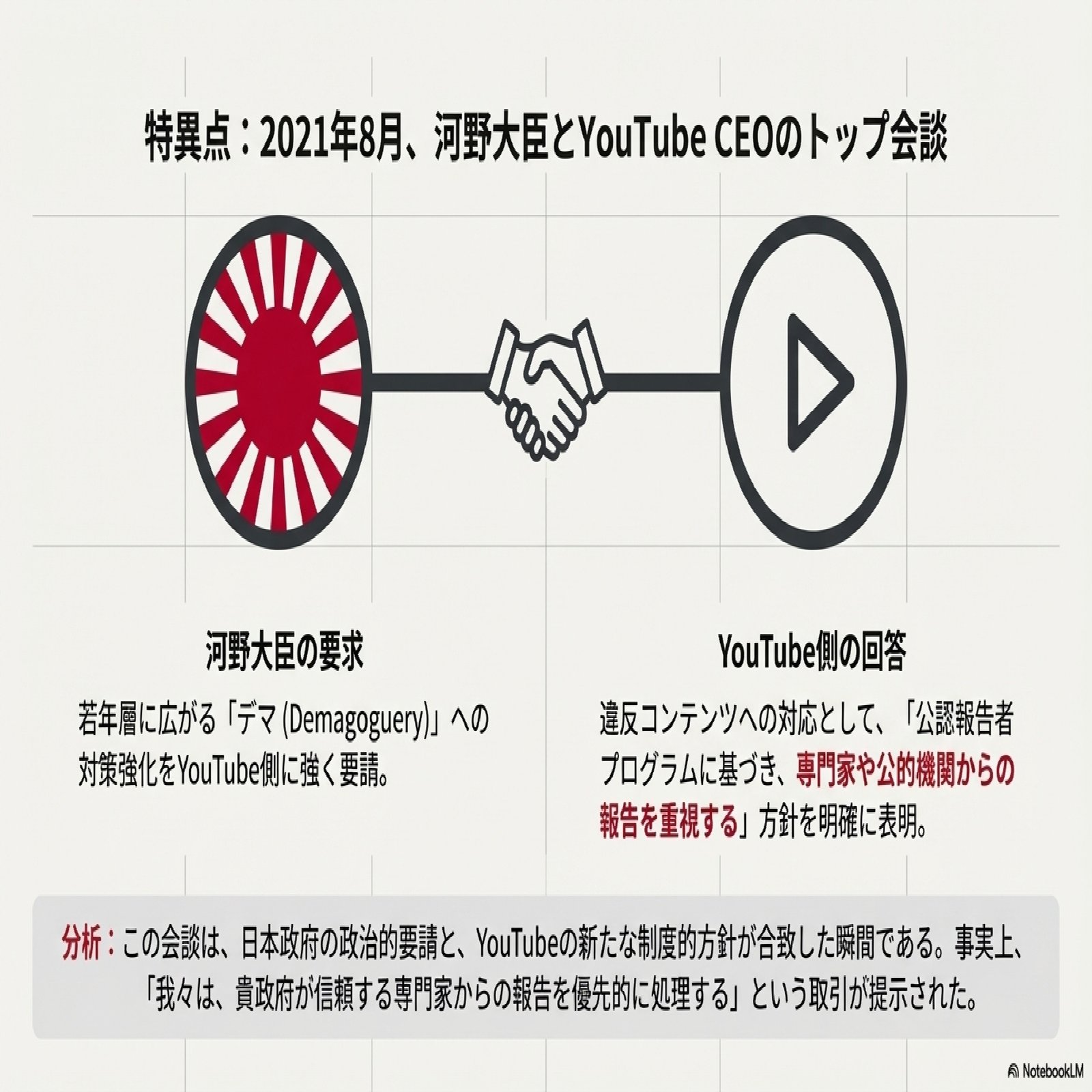 この三者間連携が形成される決定的な起点は、2021年8月に行われた河野太郎ワクチン担当大臣とYouTube CEOスーザン・ウォシッキー氏によるトップ会談であった。会談の目的は若年層へのワクチンに関する「デマの打ち消し」と「正確な情報の拡散」にあったが、その実態は日本政府の政治的要請とプラットフォームの技術的権限を結びつけるための交渉であった。