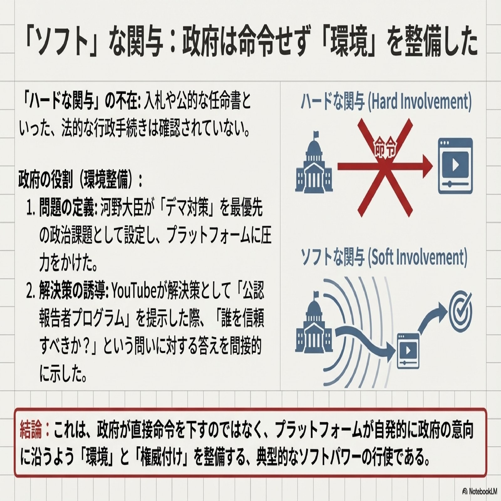 本事例研究で明らかになったのは、2021年のワクチン接種期において、政府の「ソフトな関与」の下、民間専門家(コロワくんサポーターズ)とプラットフォーム(YouTube)が連携する強固な情報統制モデルが確立されていた事実である。 この官民連携スキームの本質は、政府が法規制というハードパワーを使わず、民間のアーキテクチャと権威を利用して情報空間を管理する「ソフトパワーによる統治」にある。