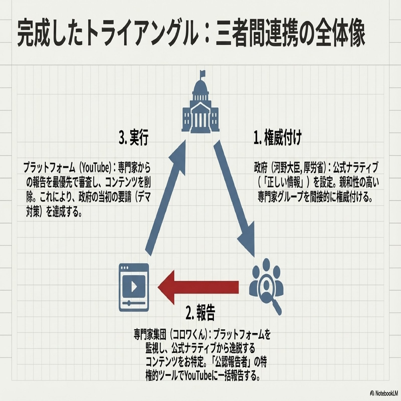 プラットフォームによる形式的実行: 最後に、民間プラットフォーム(YouTube)が、その報告を「専門家の知見」として重視し、自社の利用規約に基づいてコンテンツを削除する。