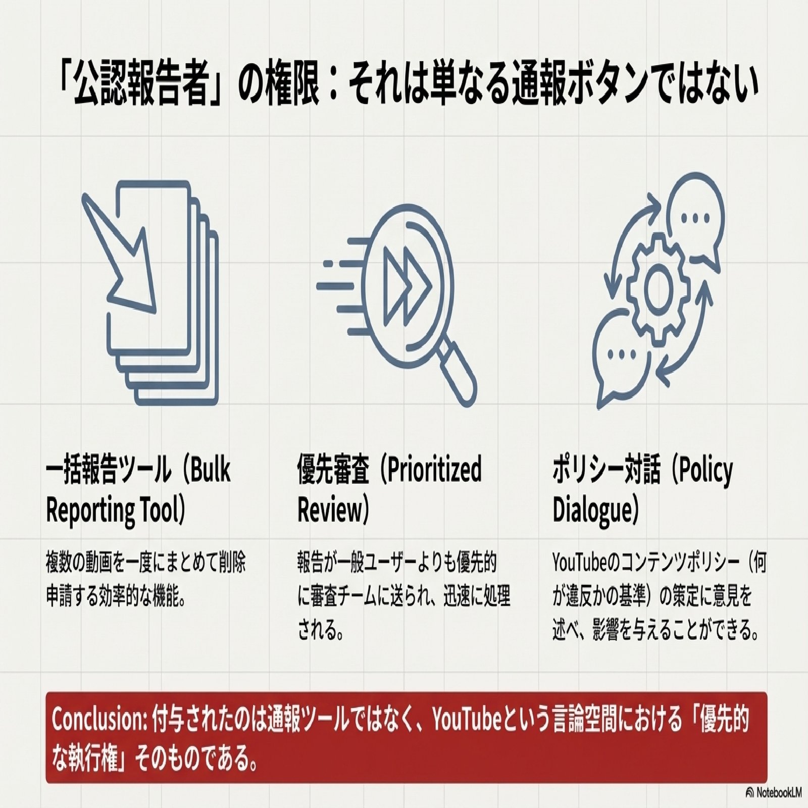 公認報告者に与えられた権限は、一般ユーザーが持つ報告機能とは質的に全く異なるものであった。それは単なる「通報」ではなく、プラットフォームの意思決定プロセスに深く関与する「優先的な執行権」であった。