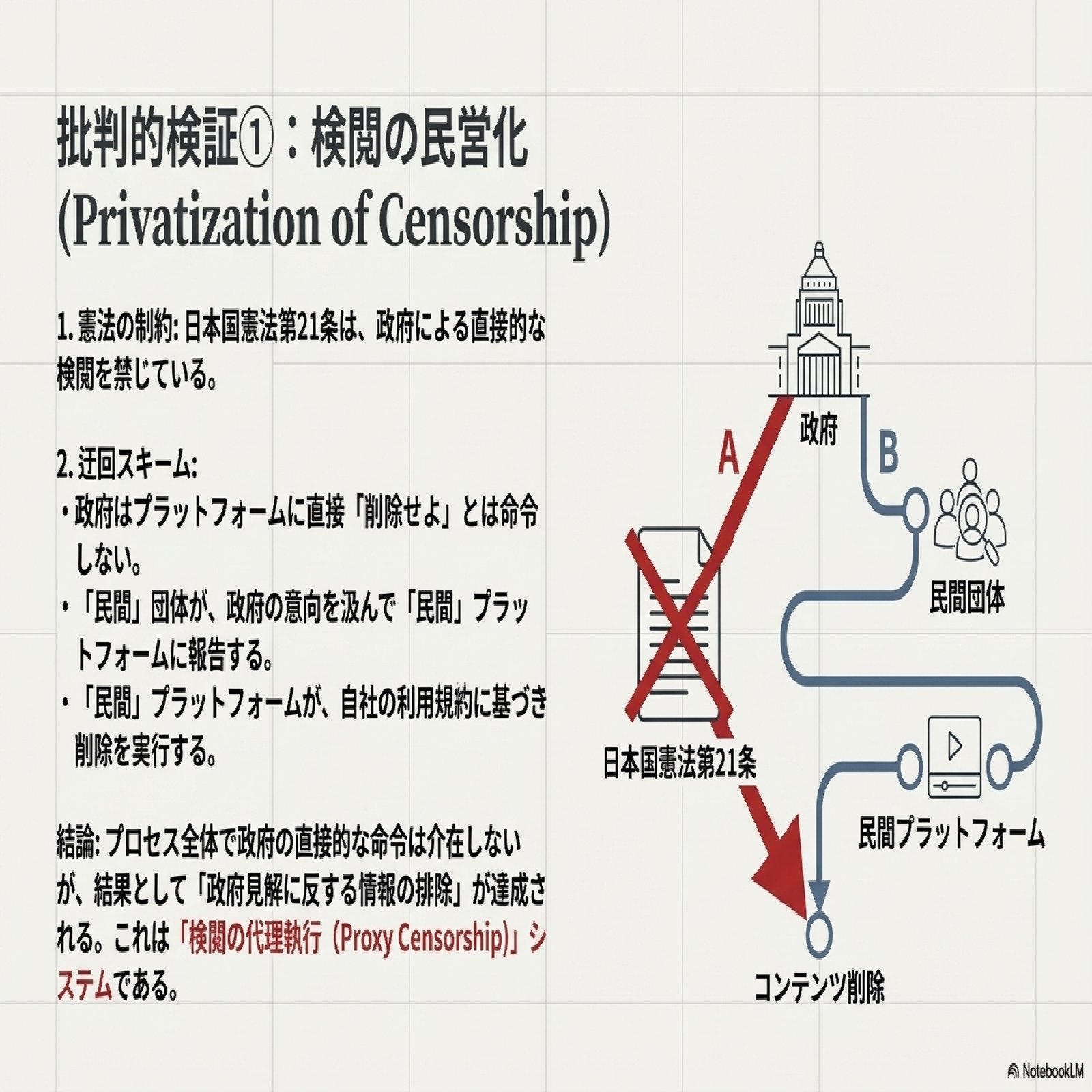 日本国憲法第21条は、公権力による「検閲」を明確に禁じている。しかし本事例のスキームは、この憲法上の制約を回避しつつ、実質的に同様の結果を生み出す巧妙な迂回プロセスを構築している。このプロセスは、**「検閲の代理執行(Proxy Censorship)」**と呼ぶべき構造を持つ。