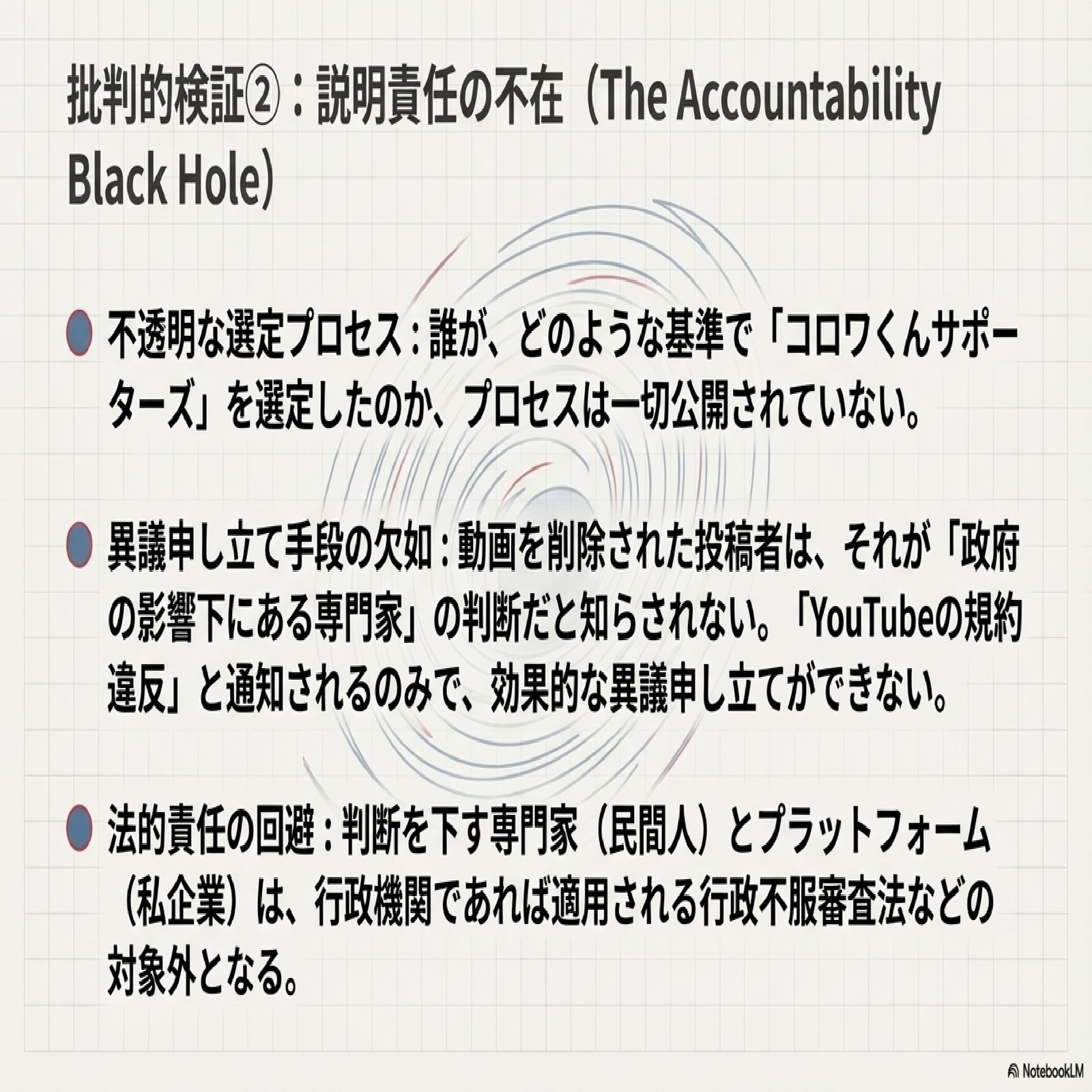 このスキームにおける最大の問題は、そのプロセスの徹底した不透明性にある。誰が、どのような基準でコロワくんサポーターズを公認報告者に選定したのか、その選考過程は一切公開されていない。さらに、彼らの報告によってコンテンツを削除された投稿者には、その判断に「政府の影響を受けた専門家」が関与したという事実は一切知らされない。