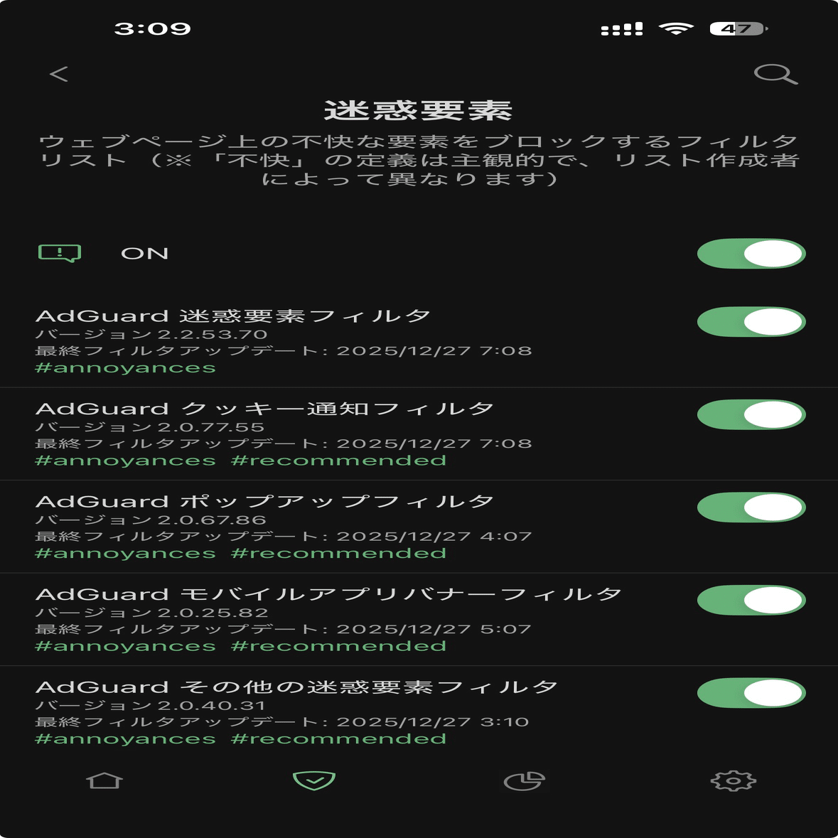 Adguradを開いたら、下のタブから逆三角のアイコンを押して、この画面を開きます。