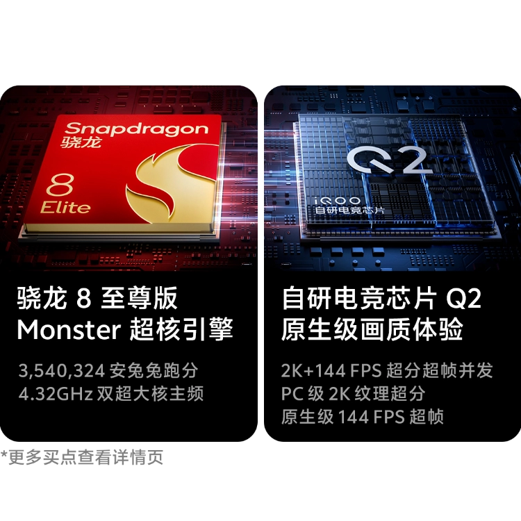 骁龙 8 至尊版|自研电竞芯片 Q2|Monster 超核引擎|2K 144Hz 珠峰屏|7500mAh蓝海电池|8K冰穹VC液冷散热系统|IP68&69防尘防水|OriginOS 6