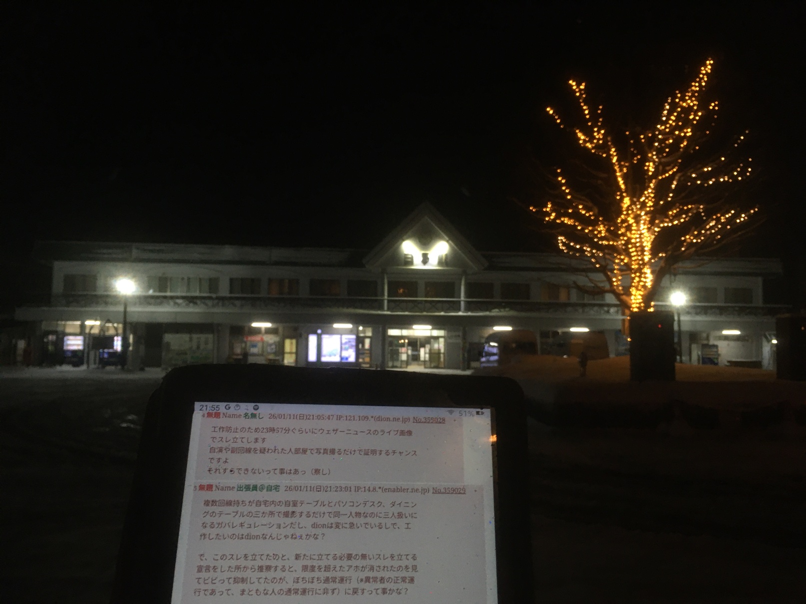 | … | 4無題Name名無し 26/01/11(日)21:05:47 IP:121.109.*(dion.ne.jp)No.359028+工作防止のため23時57分ぐらいにウェザーニュースのライブ画像でスレ立てします |