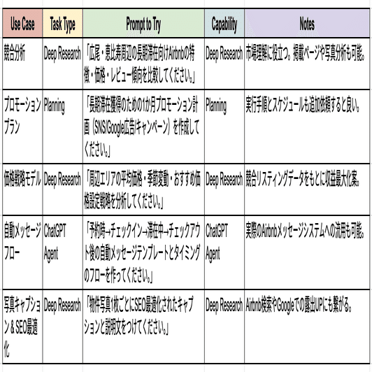 「仕事別ChatGPTの使い方」返答:(返答文を省略してアイデアテーブルのみ掲載します)
