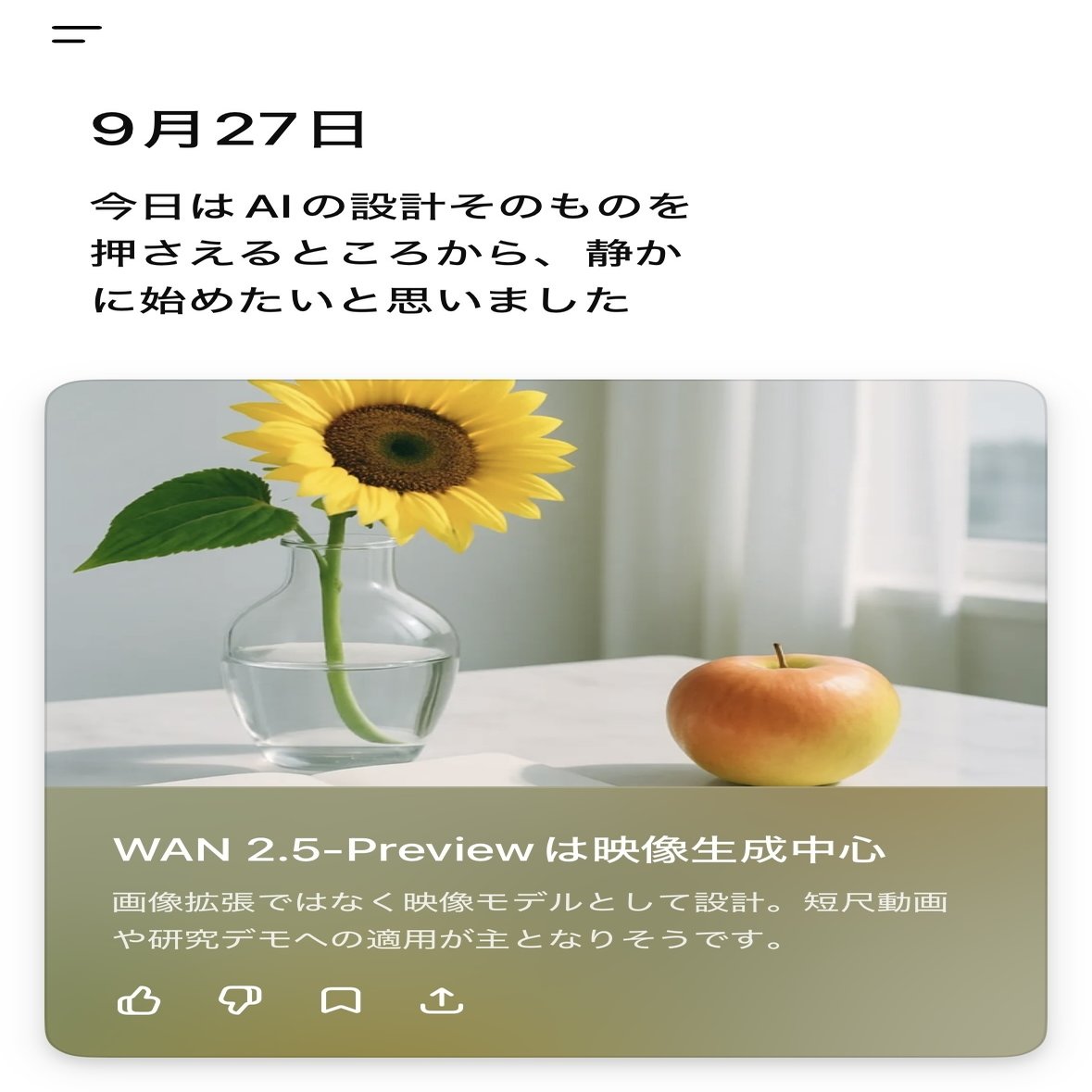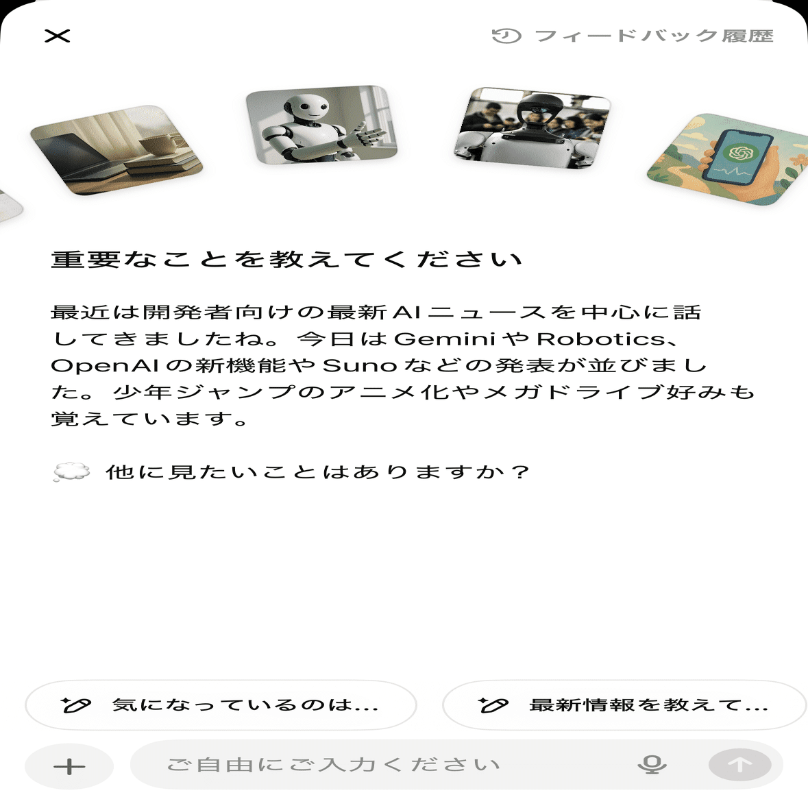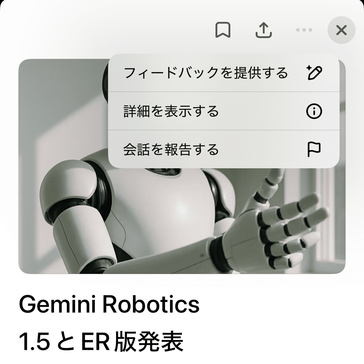 特定のトピックについてフィードバックを送信するには、3点メニューを選択して「フィードバックを送信」を選択してください。テキストフィールドにフィードバックを送信してください。親指で簡単なフィードバックを送信することもできます。