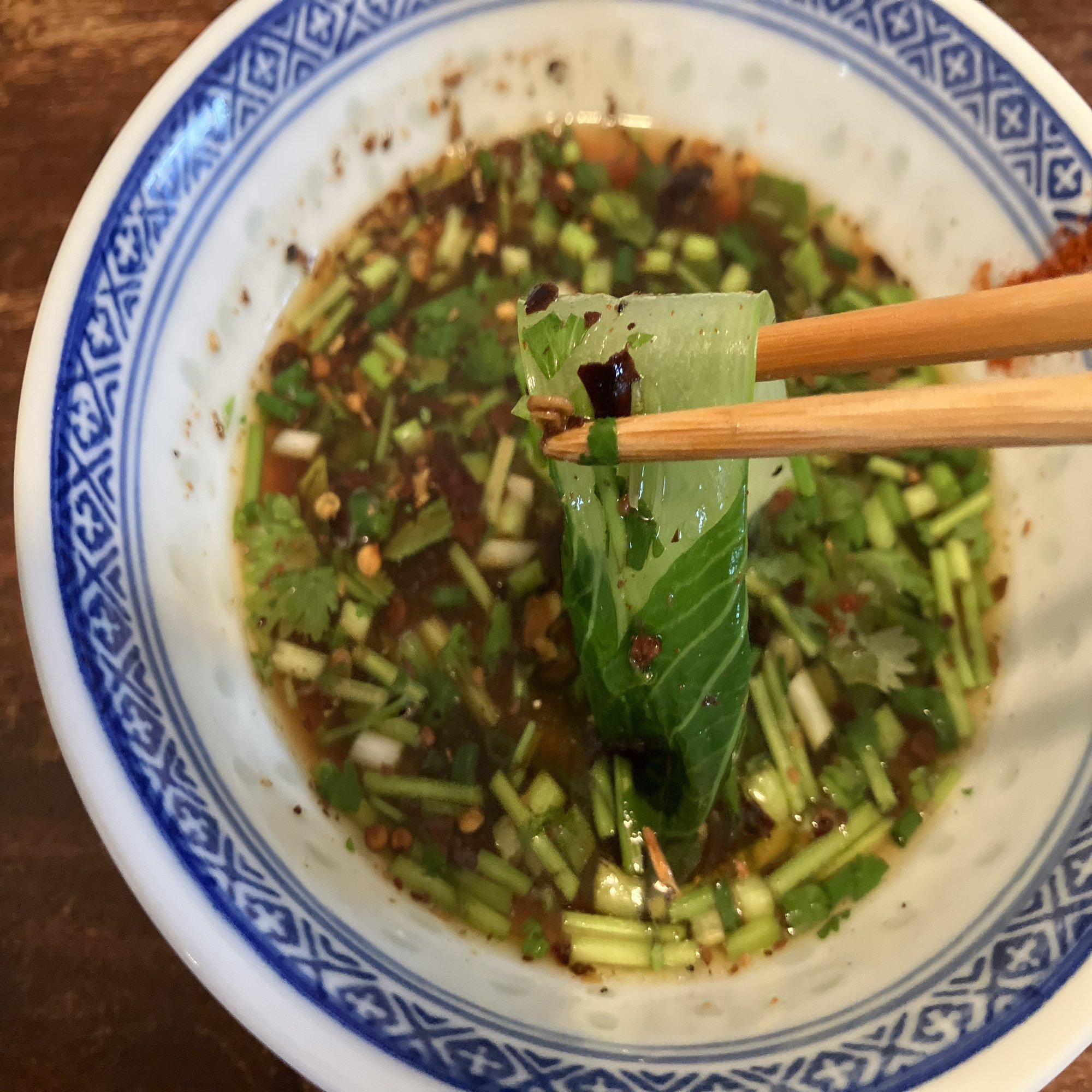 この料理の場合、小さな碗に粉唐辛子と刻んだ香菜や小葱を入れておいて、そこに青菜の茹で汁を注いで蘸水にする。ダシは一切加えず、野菜に野菜をからめて食べるだけなのだが、これが妙に旨い。様々な香りが青菜の甘味を引き立てるのだ。