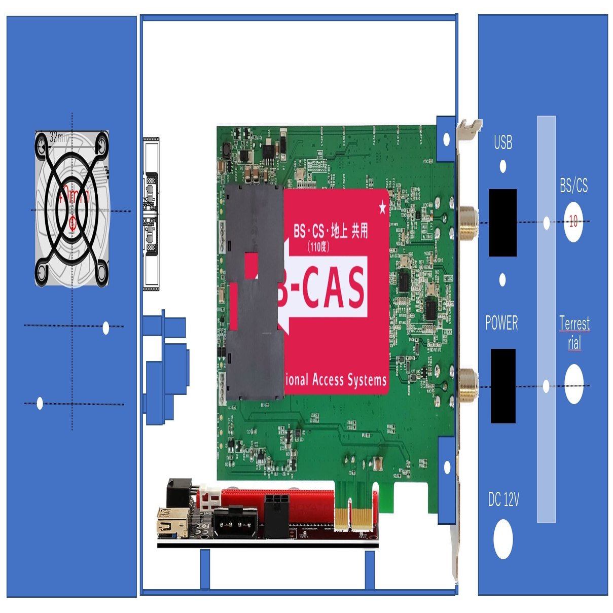PLEXのPX-MLT8PEは、PC内蔵型のカードですが、PCI-Expressバスは+3.3V給電のみに使用され、実際のホストインタフェースはUSB接続となています。そのため、マイニング用PCI-Expressライザーカードを利用・給電を行えば、基本的にUSBのみコネクタを用意すれば、容易に外付けBOX化できます。