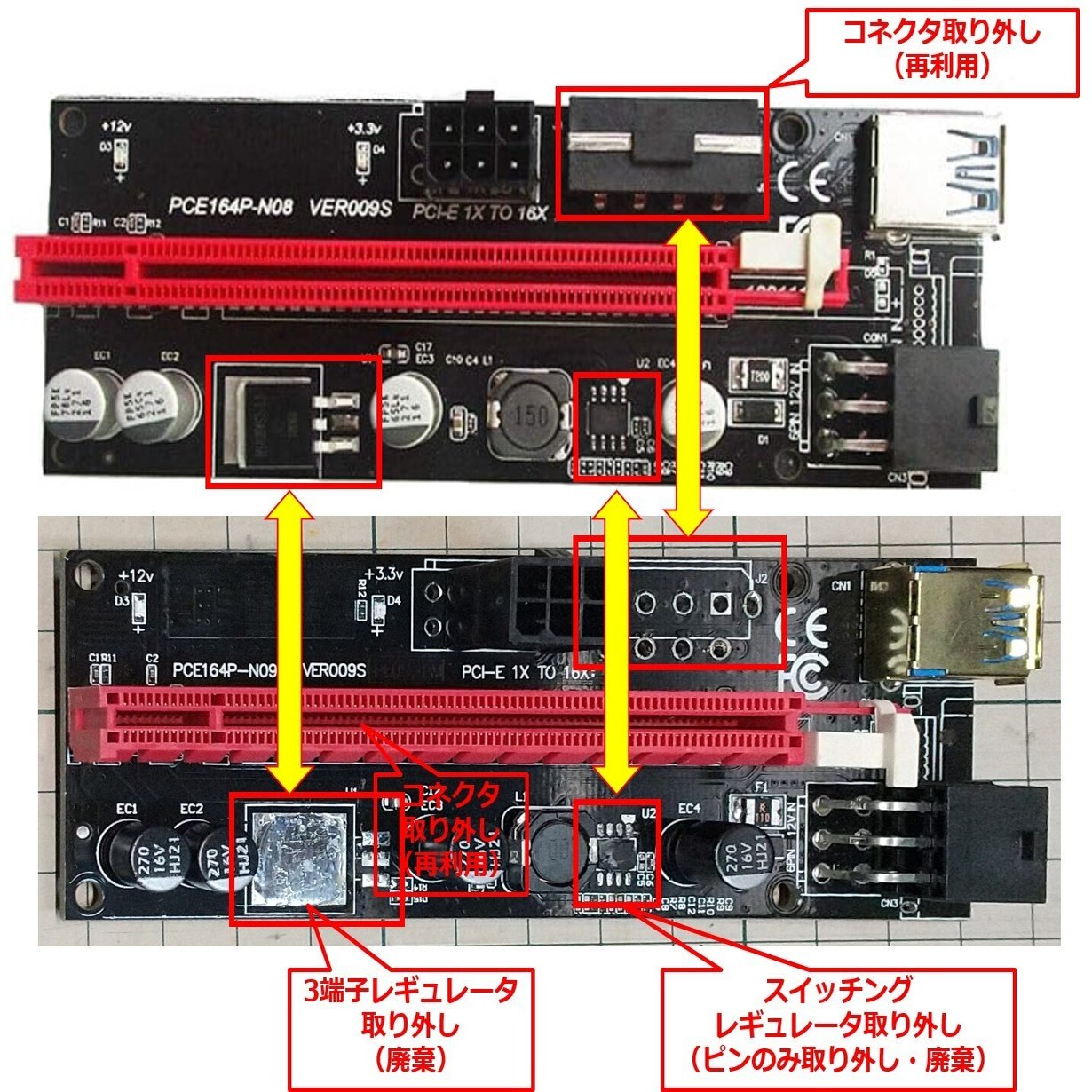 ライザカードの給電回路は、+12Vを一旦、8PinSOPのスイッチング電源ICで降圧、その後、3端子レギュレータ(ドロッパ)により+3.3Vを作成しています。そのため、PCI-Expressバスの最大給電能力の3Aを保証できず、3A近くの電流が流れると、3端子レギュレータにサーマルプロテクションがかかり、電圧が低下してしまします。