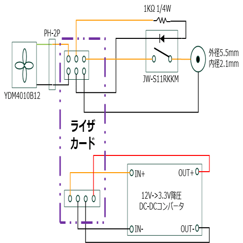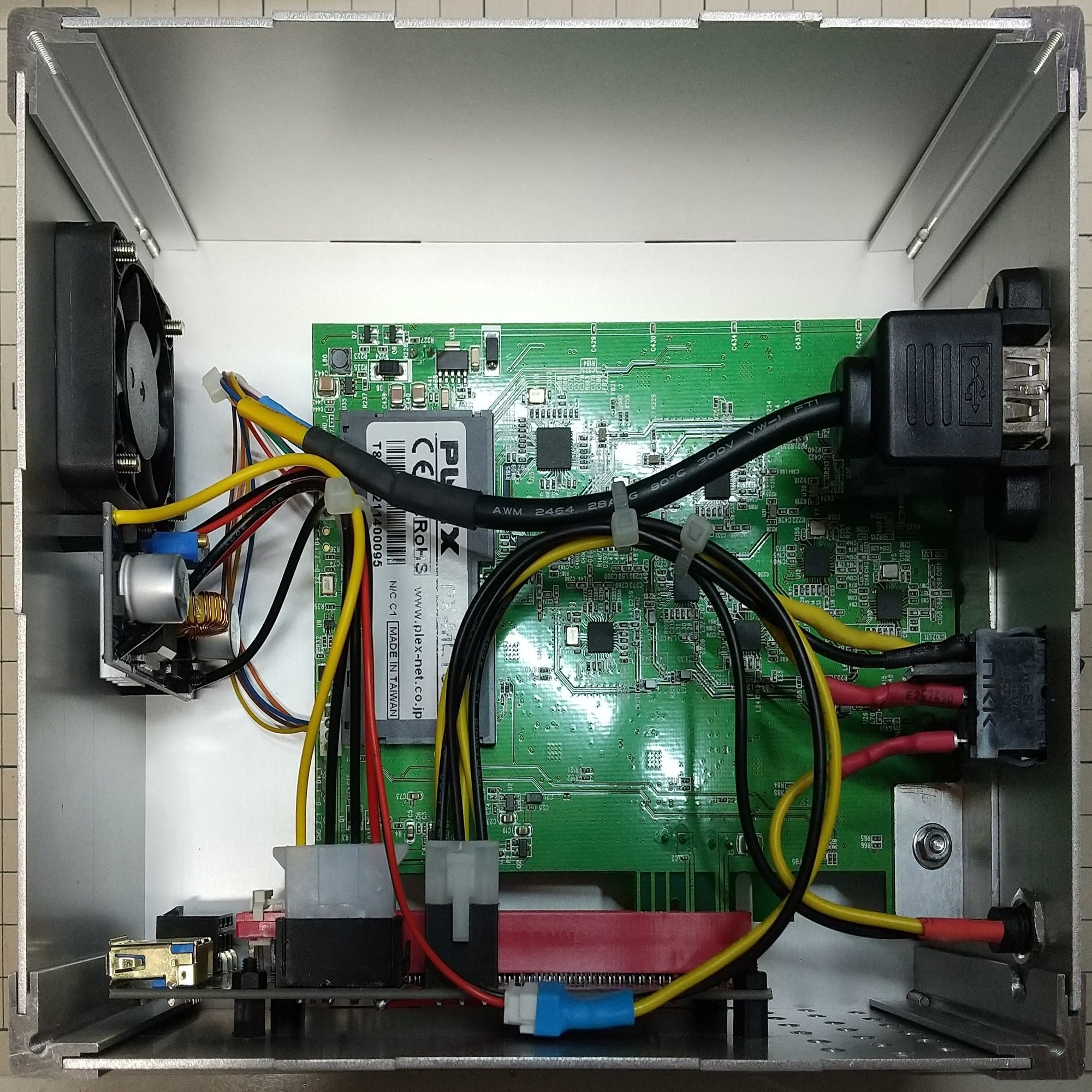 このBOX内に以下の様にFAN、ライザカード、チューナーカード、降圧コンバータ、スイッチコネクタ等を配置しています。