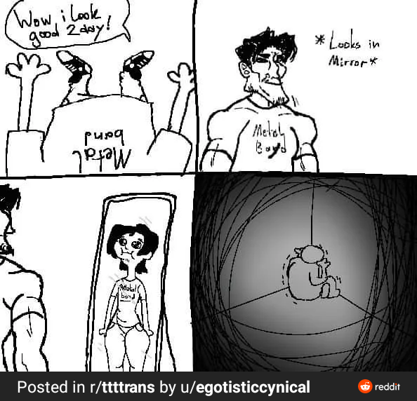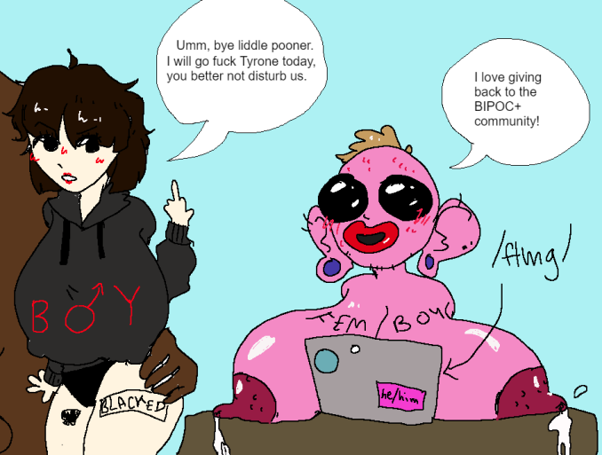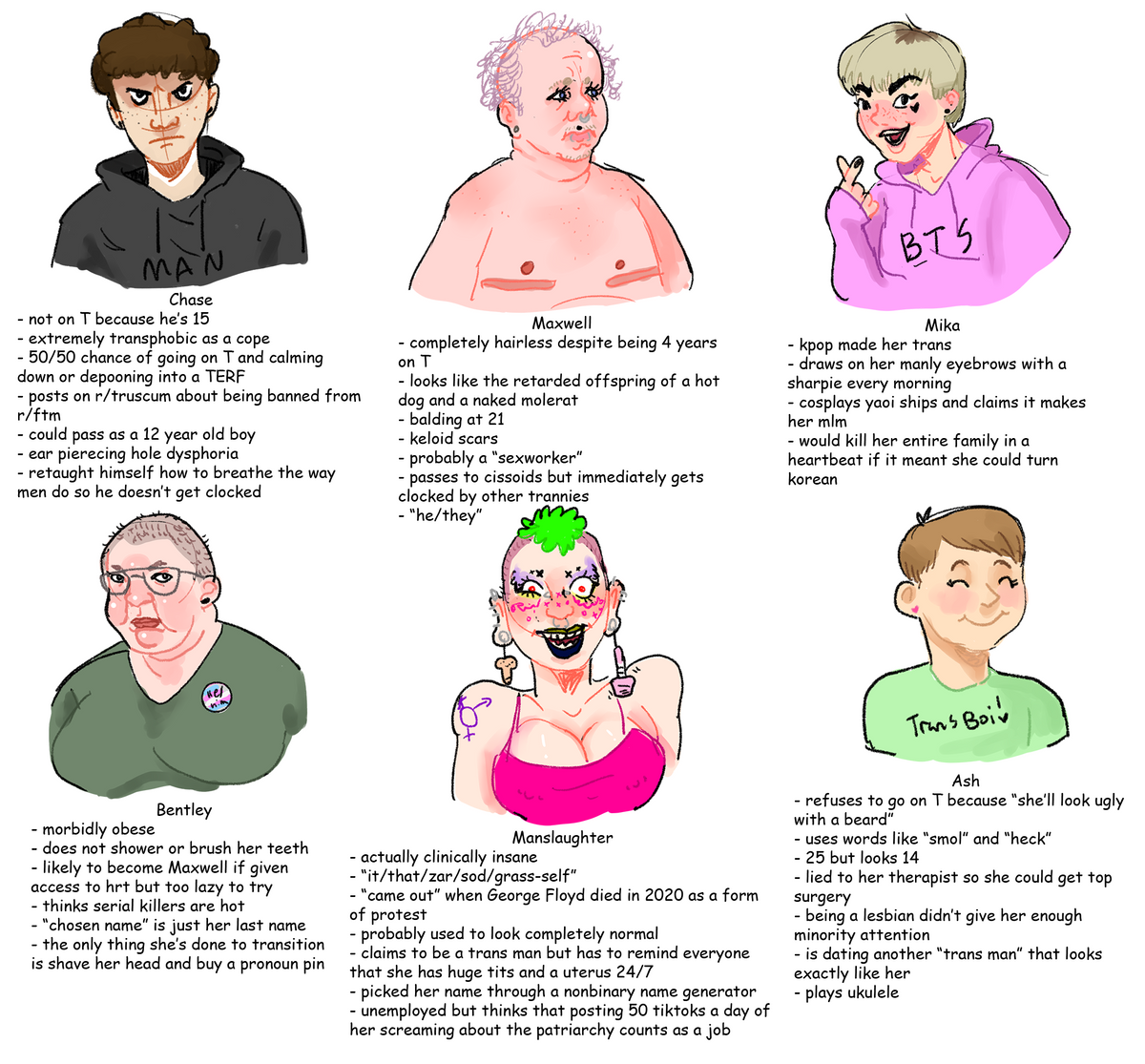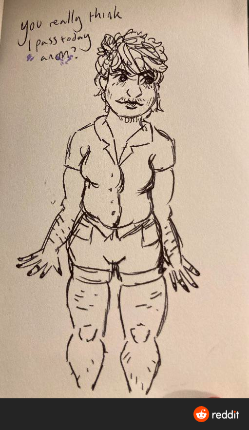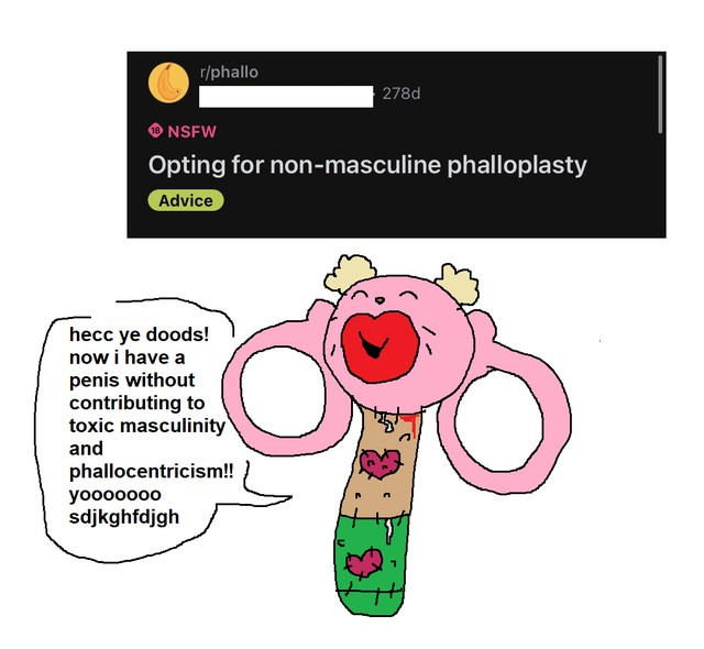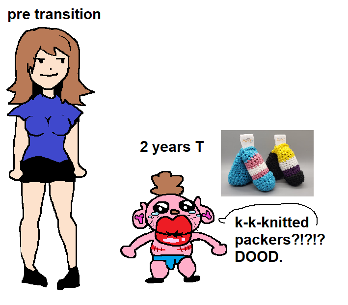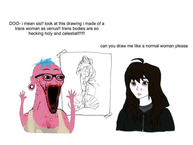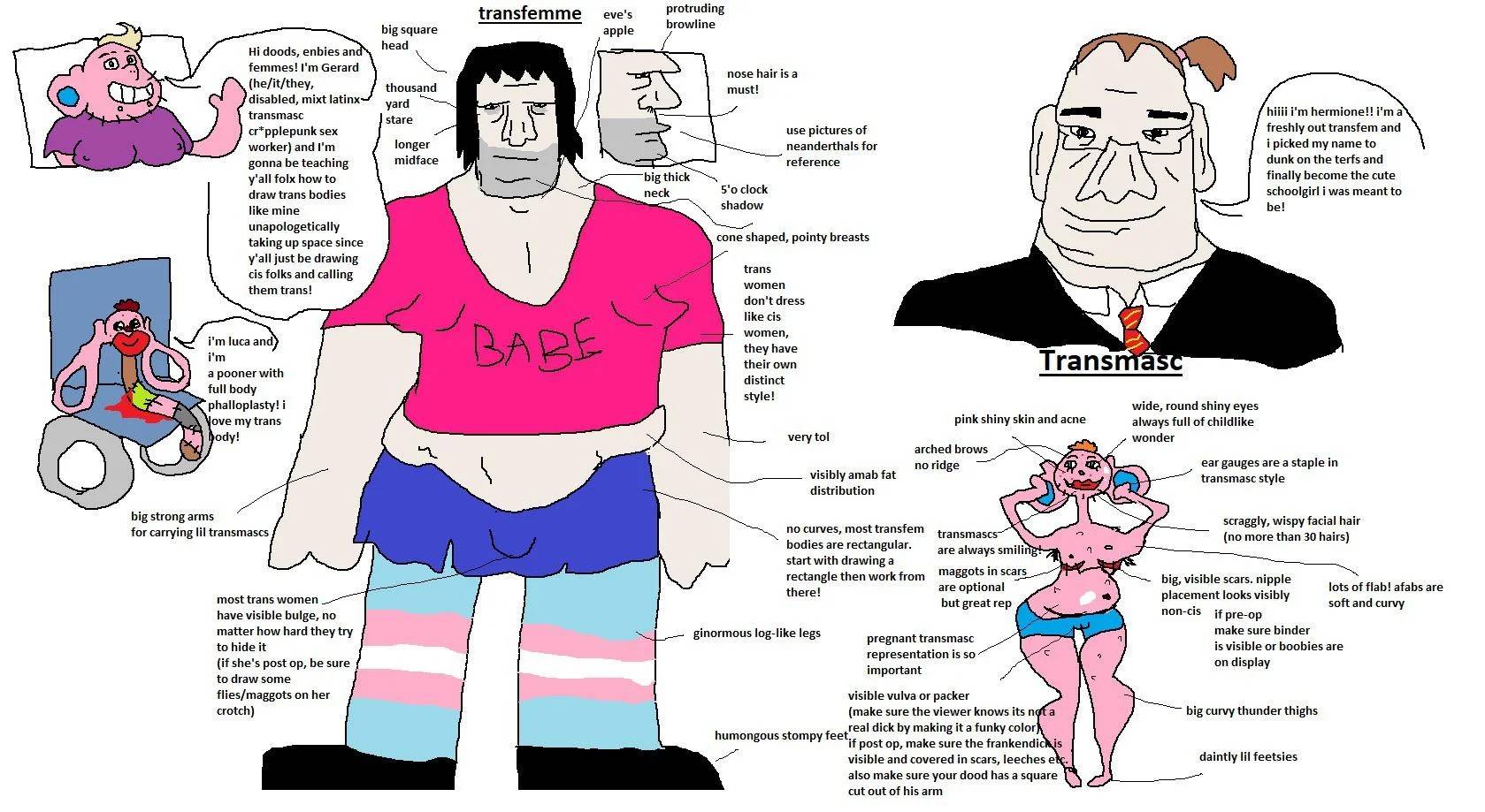 Why FtMs chose to depict themselves as such freakish, misshapen golems is anyones guess, and likely comes down to the extreme self hatred and body dysmorphia that female troons experience, its like if anachans were to draw each other as ghoulish skeletal Lich's.