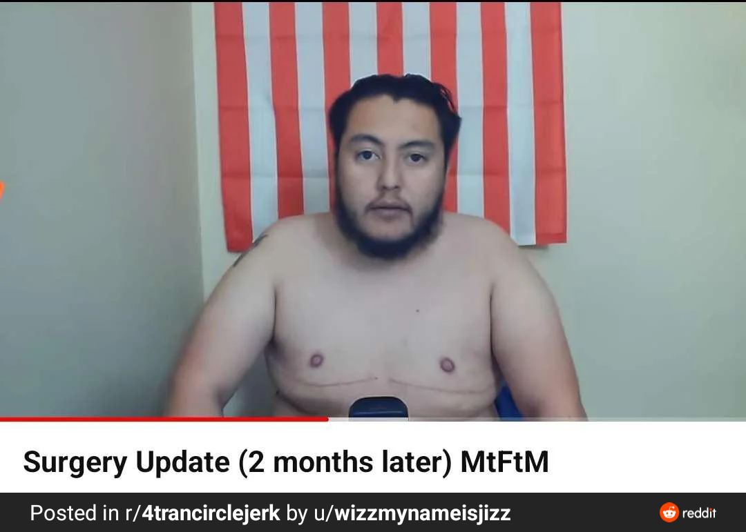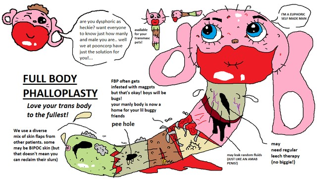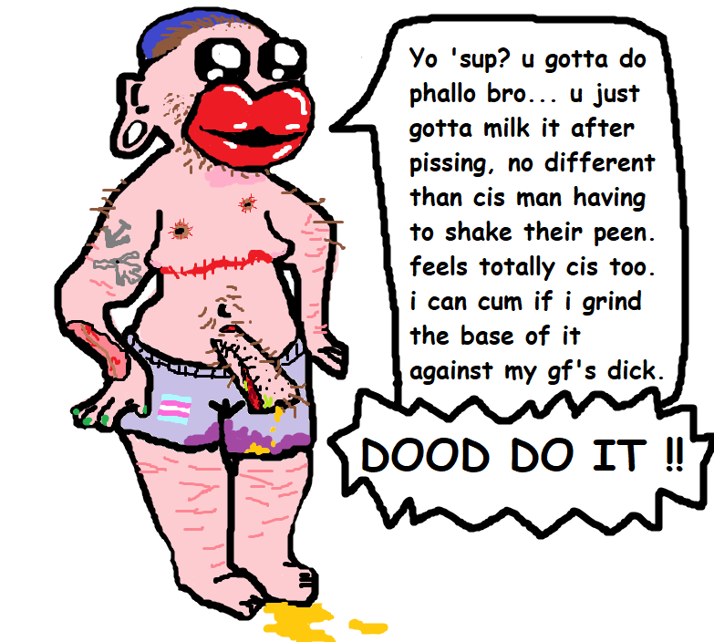 They also tend to have visible self harm scars, (another indication of the self loathing), huge stretched ear gauges, and often the tell tale flayed arm that comes as a result of the FtMs fake Phallo surgery, where a chunk of flesh is flayed from their arms and rolled into a rough approximation of a penis (to a blind person maybe) and then stitched to the Pooners crotch until it likely rots off.