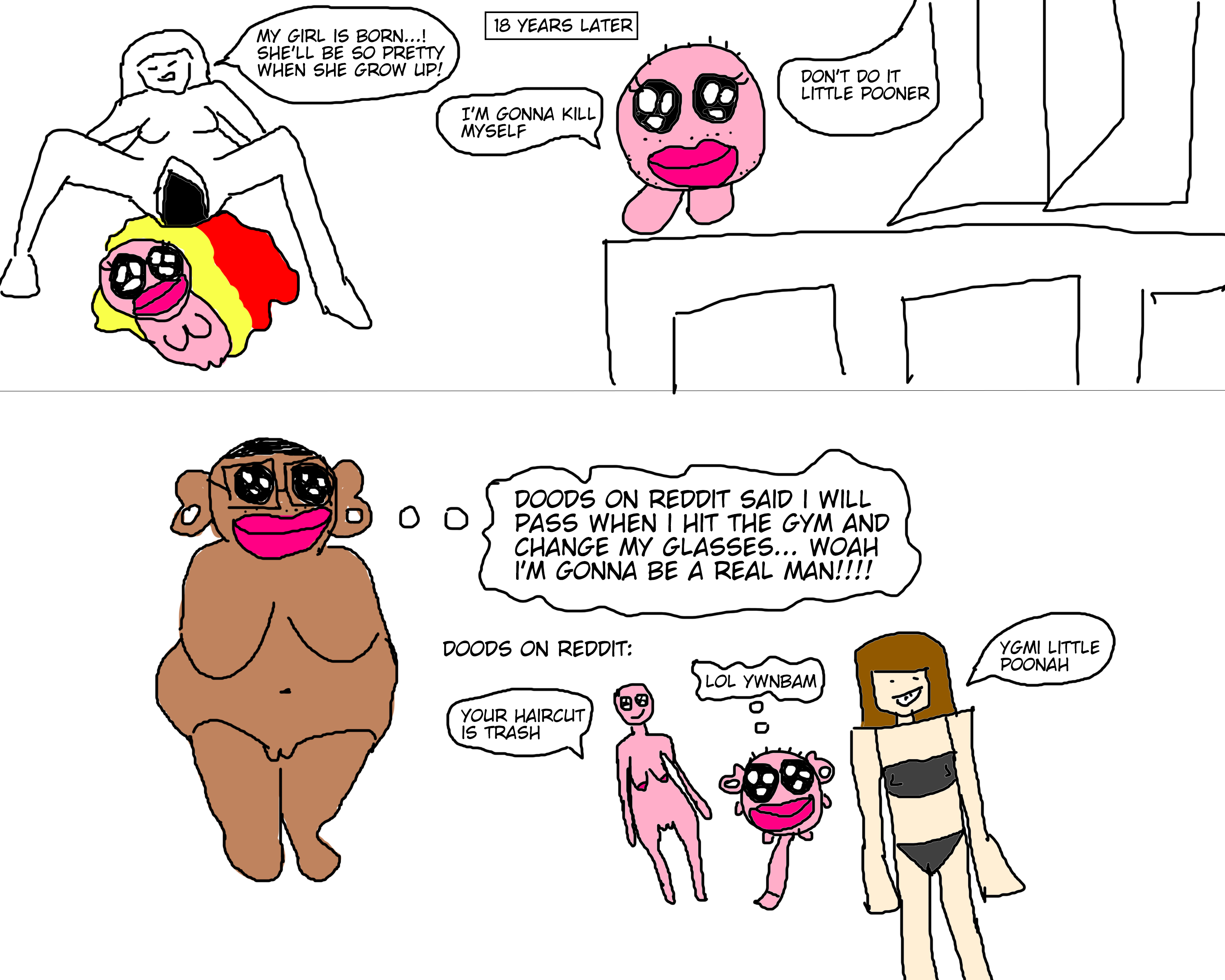 Pooners are also typically short, weird, weak little creatures, displaying the FtMs knowledge and resentment that as hard as they try they can always only be manlets, and will never be taken seriously.