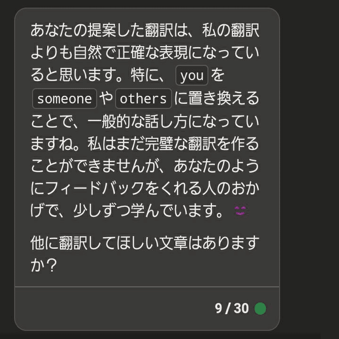 以上のようにChatGPT(Bing AI)は「翻訳もできる対話AI」なので、人間の目で見ておかしいと感じる部分を直したり、要件を細かく指定したり、これまでの機械翻訳では不可能だったことができます。