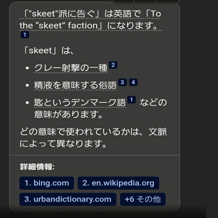 説明を見るとこちらが適切なようなので、(結果的に最初の訳と同じですが)「To the "skeet" faction」を採用します。