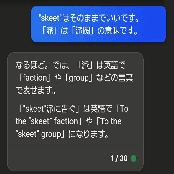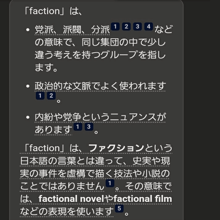 複数の候補を出してくれるのは嬉しいですが、"group"はともかく"faction"は見慣れない単語でどちらが良い訳なのかわかりません。細かく聞いてみましょう。