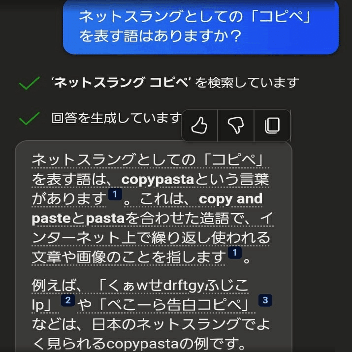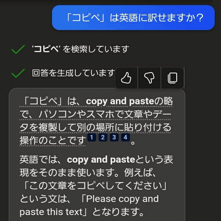 DeepL翻訳でも「copy and paste」と出ますが、ネットスラングの「コピペ」に当たる言葉は英語でも存在するか聞いてみましょう。