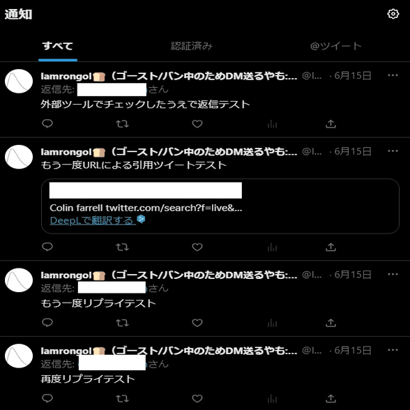 メインアカウント( @lamrongol )から旧Bot用アカウントへの返信、引用ツイートが表示されるかのテスト結果です。