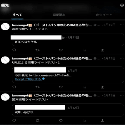 アカウントごとに「リプライは表示されるがRTボタンからの引用ツイートは表示されない」「リプライは表示されないがRTボタンからの引用ツイートは表示される」と違いがある。