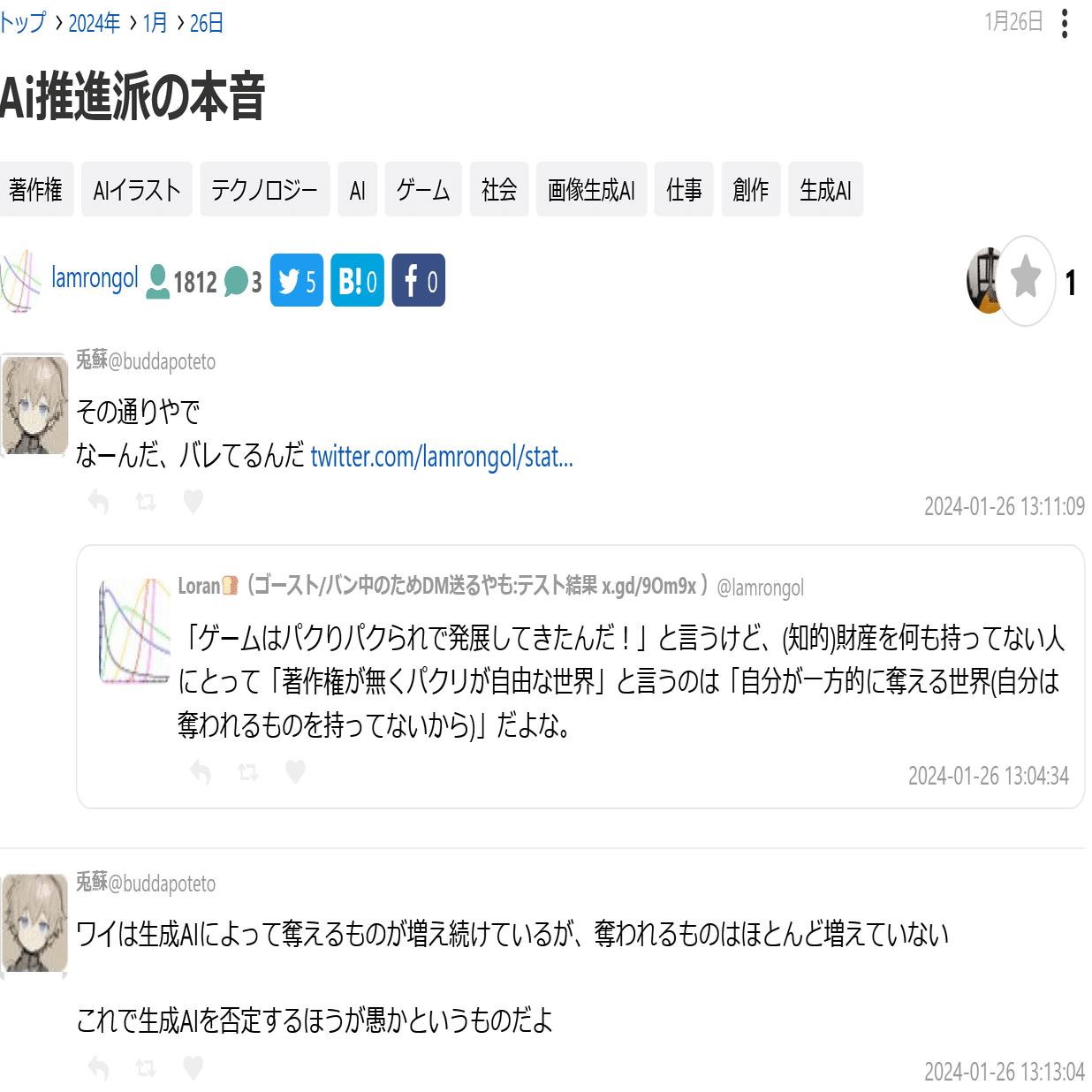 私は生成AIという「最先端技術」━━実際、LLM(大規模言語モデル)だけならそれは本当に新技術であった━━についてもっと高度な議論が展開されるのだと思っていた。だがそんなことは起こらなかった。「ラッダイト」「人間も無断学習してる」「二次創作」と同じ主張がbotのように繰り返されていた。そもそも、赤松健の「クリエイターへの還元」という主張にも大きな問題があるのだ。どうやって還元するのかとか、そもそも学習されたくないとか(勝手にイラストを描く契約を結ばされるようなものだから)。だが、AI絵師の主張は「無断学習は問題ない」というもので、「許可」も「学習料の還元」も不要というものだったから、彼らは本来なら赤松健にも反論しなければならないハズなのに誰もそんなことはしなかった。