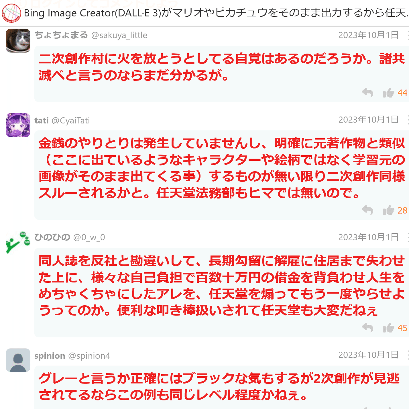 仮に生成AIが現行法で合法だとしても、「AI学習しないでくれ」と表明(お願い)することは別に違法ではないのに、「AI学習禁止」と書く━━「表現する」━━ことさえ法律を遵守しない行為だと言うのだ。それこそ「表現の自由・言論の自由」に対する攻撃だろう。だいたい法律で禁止されてなくても「規約で禁止」などは沢山ある。先にも書いたが二次創作だって権利者がダメと言えばダメなのだ。これで「法律に詳しい」「技術に詳しい」面をしているのである(AIシンパは皆そうだが)。それに絵描きに対する激しい攻撃についても私よりよく知っていたはずなのになぜ何もしなかったのか。「AI学習禁止」と書く表現の自由は無いがネット私刑は表現の自由と言うことか。