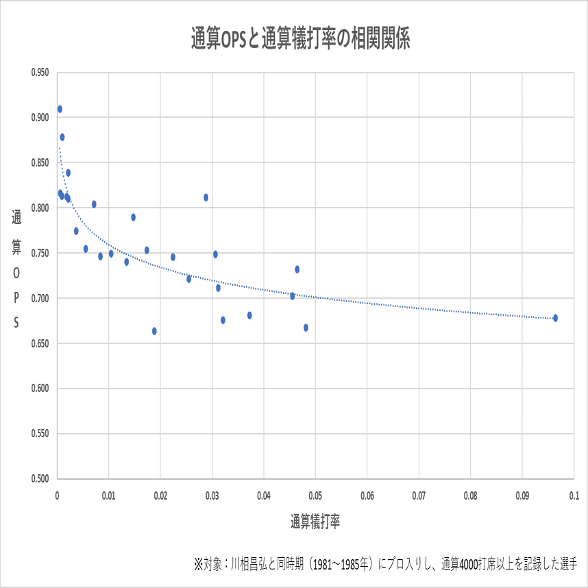 それを確認するため、川相と同時期にプロ入りした選手を対象に、通算OPSと通算犠打率(1打席あたりの犠打数)の相関関係を見てみます。