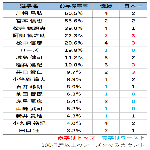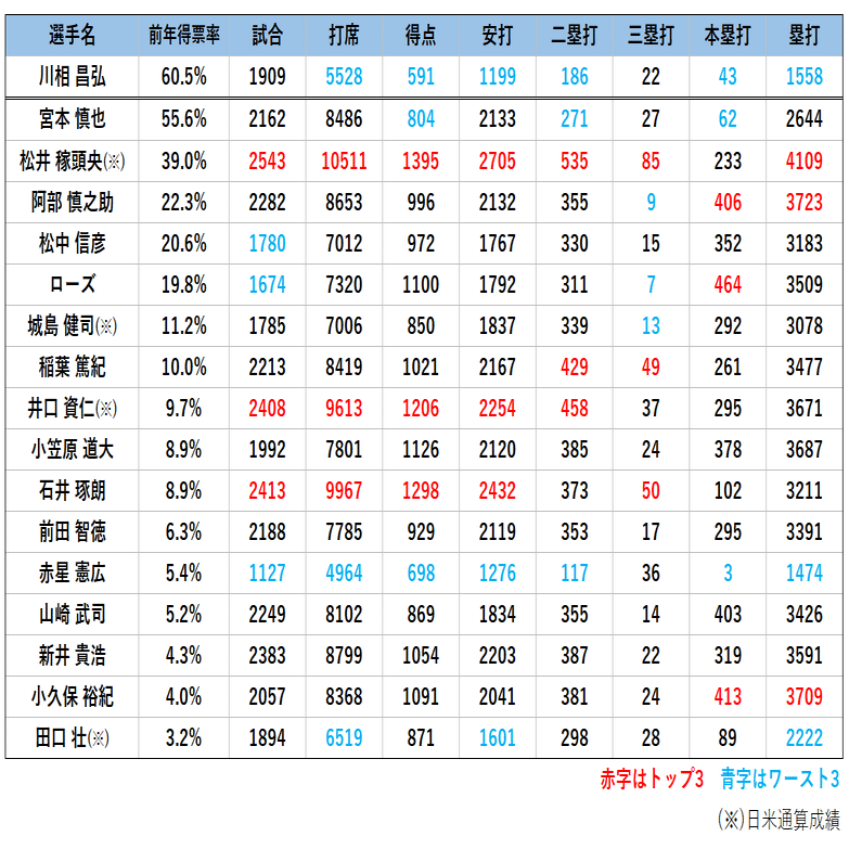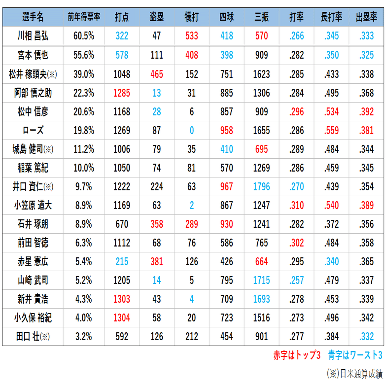 少なくとも、他の打撃指標で群を抜いた成績を残している選手と、同列に評価することには違和感を覚えます。
