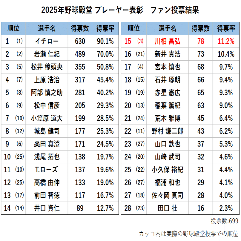 その結果、川相のファン投票選出回数は1回にとどまり、これは候補者の中でワーストタイの数字となっています。少なくとも、ファンからの人気という観点において、殿堂入りにふさわしいと評価できるほどの実績を残しているとは言えなさそうです。