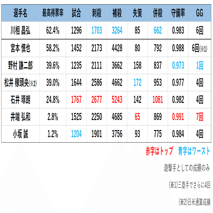 ここでは川相と同じく遊撃手としてプレーした候補者に絞って比較を行います。ただし、それだけではサンプル数が限られるため、過去10年間のプレーヤー表彰で候補者となった遊撃手も比較対象に加えました。